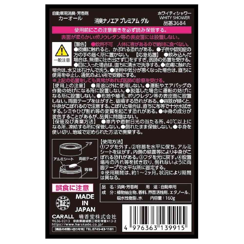 ナノ成分と消臭アロマ配合のプレミアム処方! ナノ成分が悪臭と反応してスピーディーに消臭! 消臭アロマの優しい香りが広がり、心地よい空間を演出! ドリンクホルダーにピッタリな置き型タイプ。 使用期間 :約1~2ヶ月 ※使用状況により異なります。 ホワイティシャワー:清潔感あふれるホワイティシャワーの香り