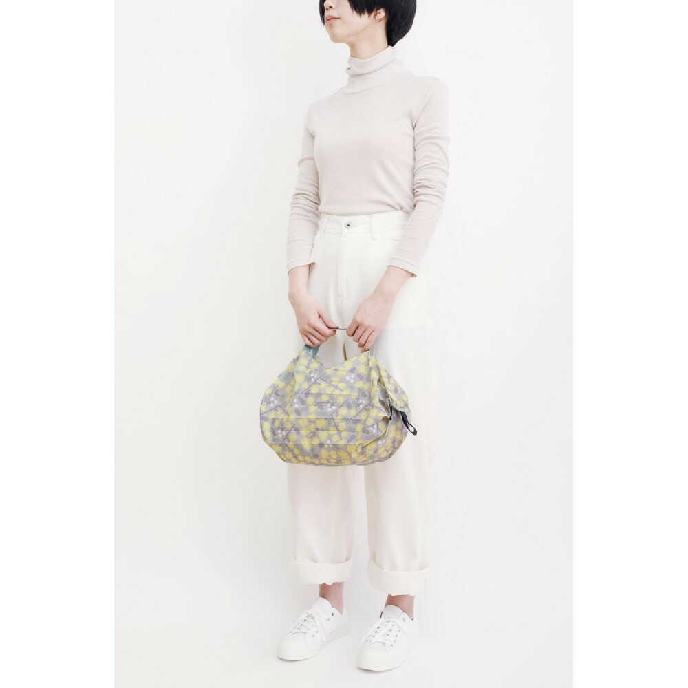 「シュパッと」一気にたためるコンパクトバッグ。 コンビニでの買い物や、急に増えた荷物入れに。 まとめる時は、ゴムで簡単に留められます。