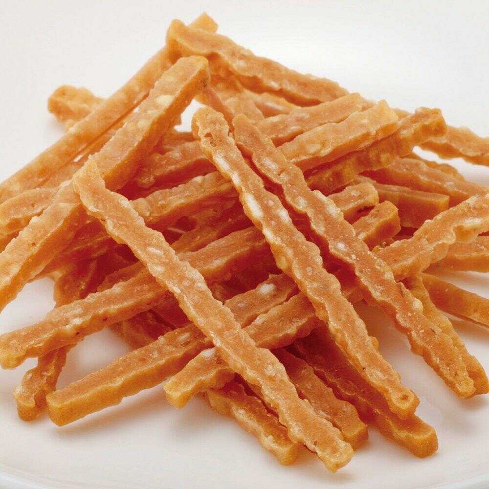 鶏ササミ、小麦粉、牛皮、糖類、タピオカでん粉、卵黄粉末(グロビゲン)、植物油脂、加工でん粉、グリセリン、トレハロース、ソルビトール、増粘安定剤(キサンタンガム)、ミネラル類(ナトリウム)、酸化防止剤(ビタミンC、ビタミンE)、ポリリン酸ナトリウム、ピロリン酸ナトリウム、着色料(クチナシ、マリーゴールド)