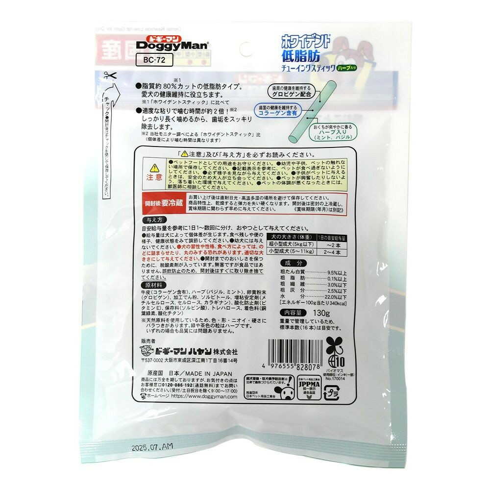 ●適度な粘りがあり、長く噛めるスティック形状ガム。 ●噛むことで歯とガムがこすれ、歯垢の沈着を抑え口臭を軽減する。 ●「ホワイデントスティック」と比較して脂質約80%カットの低脂肪タイプ。 ●歯周の健康を維持するグロビゲン配合。 ●お口が爽やかに香るハーブ入り。