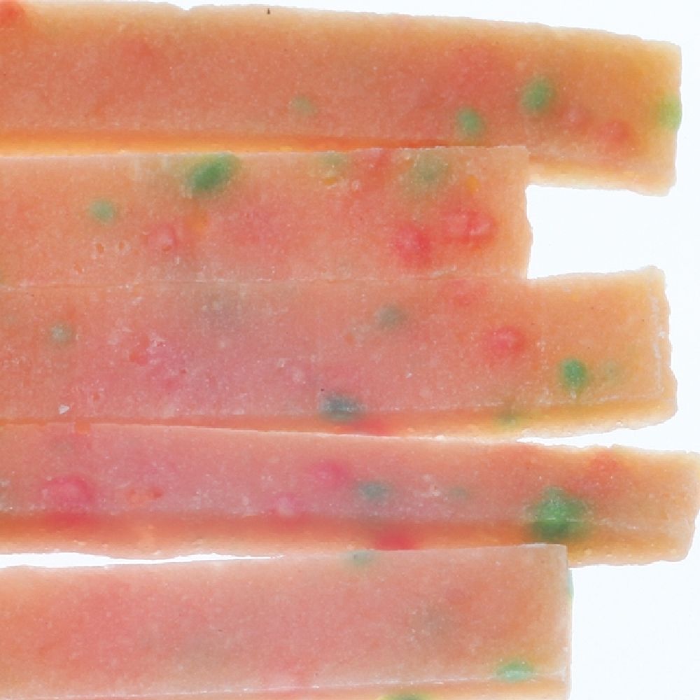 鶏肉(胸肉、ササミ)、穀類(小麦粉、米粉)、でん粉類、野菜類(にんじん、ほうれん草)、グリセリン、トレハロース、プロピレングリコール、ミネラル類(ナトリウム)、リン酸塩(Na)、酸化防止剤(ビタミンC)、発色剤(亜硝酸ナトリウム)、着色料(赤102、赤106、黄4、黄5、青1)、調味料