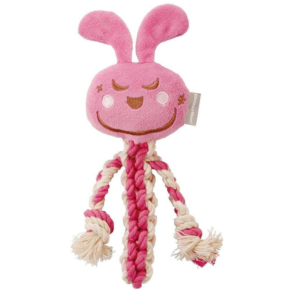 編み込まれたコットン部分を噛む事で歯が食い込み、歯と歯茎を刺激します!! わんちゃんの大好きな鳴き笛入りで、ゆらゆら揺れる手と異なる噛み心地がわんちゃんの興味を引きやすく、たくさん遊びながら噛む事でデンタルケアのできるおもちゃです。 わんちゃんと格闘しているかのような表情もかわいいうさっち。 小型犬対象。