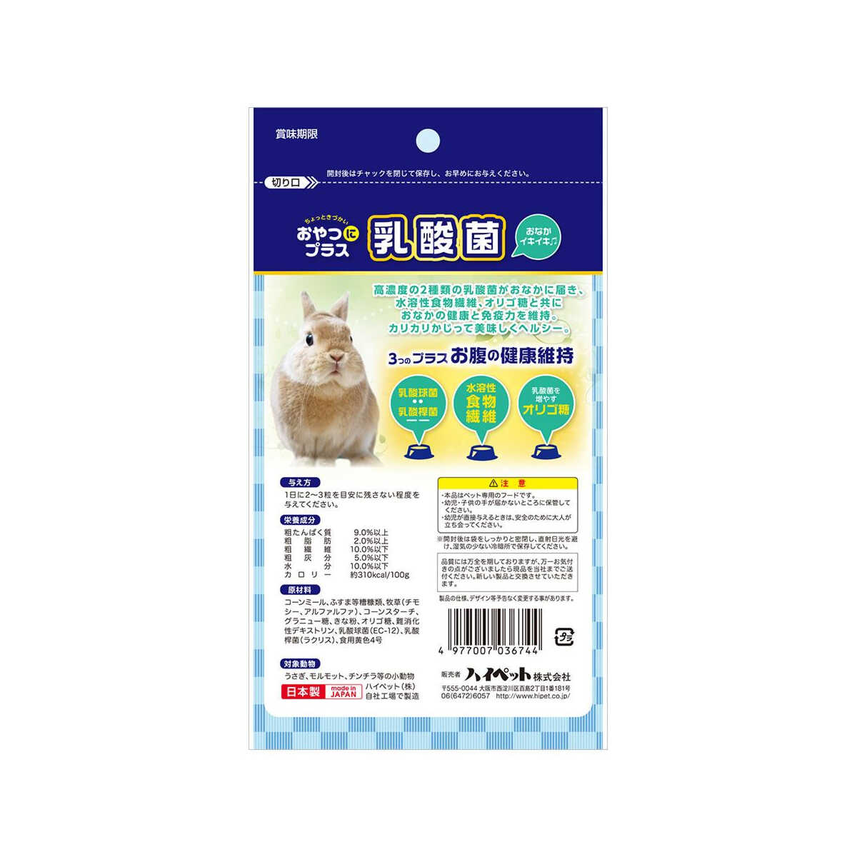 コーンミール、ふすま等糟糠類、牧草(チモシー、アルファルファ)、コーンスターチ、グラニュー糖、きな粉、オリゴ糖、難消化性デキストリン、乳酸球菌(EC-12)、乳酸桿菌(ラクリス)、食用黄色4号 粗たん白質9.0%以上、粗脂肪2.0%以上、粗繊維10.0%以下、粗灰分5.0%以下、水分10.0%以下