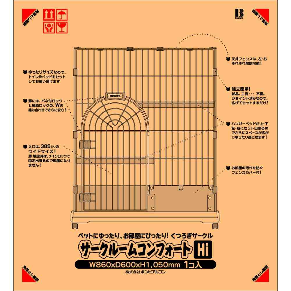 ・小さいけどゆったり!コンパクトなサイズのネコ用室内ケージです。 ・しつけるトイレC-Sサイズを縦にセットすることができます。 ・ボンビアルコン製「ウィークリートイレ」も中に置くことができます。 ・扉入り口はトイレをまっすぐ引き出せるワイドサイズ! ・扉には補助ロックとメインロックがついているので、ダブルで安心です! ・ハンガーベッドが1枚ついています。 ・移動に便利な専用キャスター(別売)も取り付け可能。
