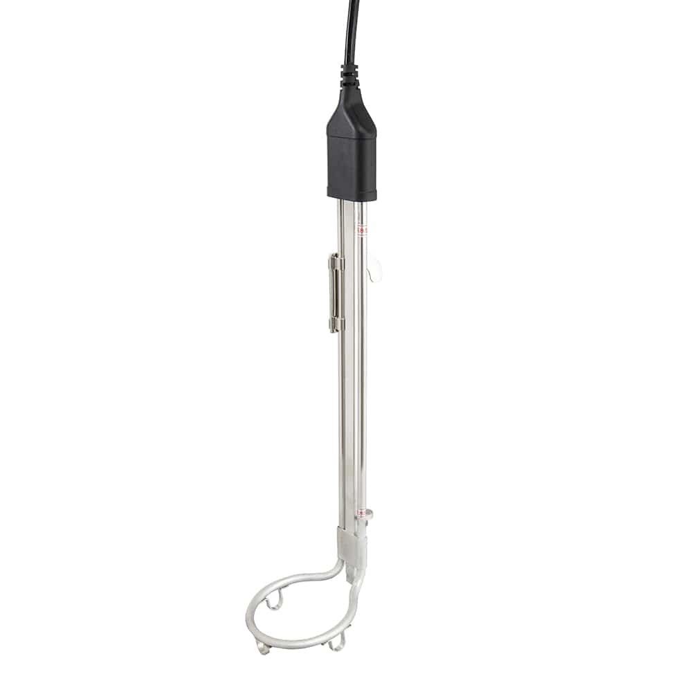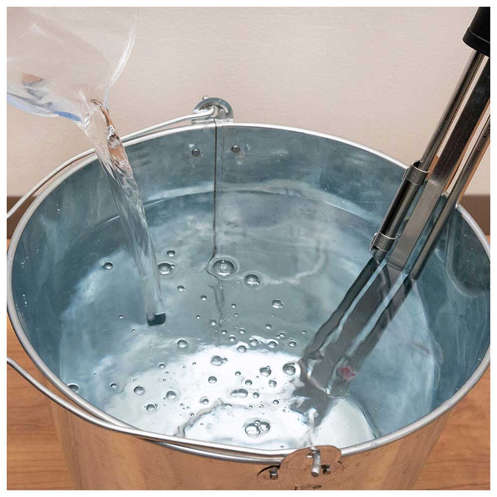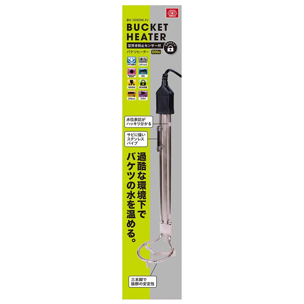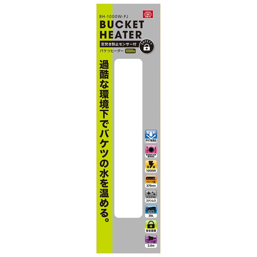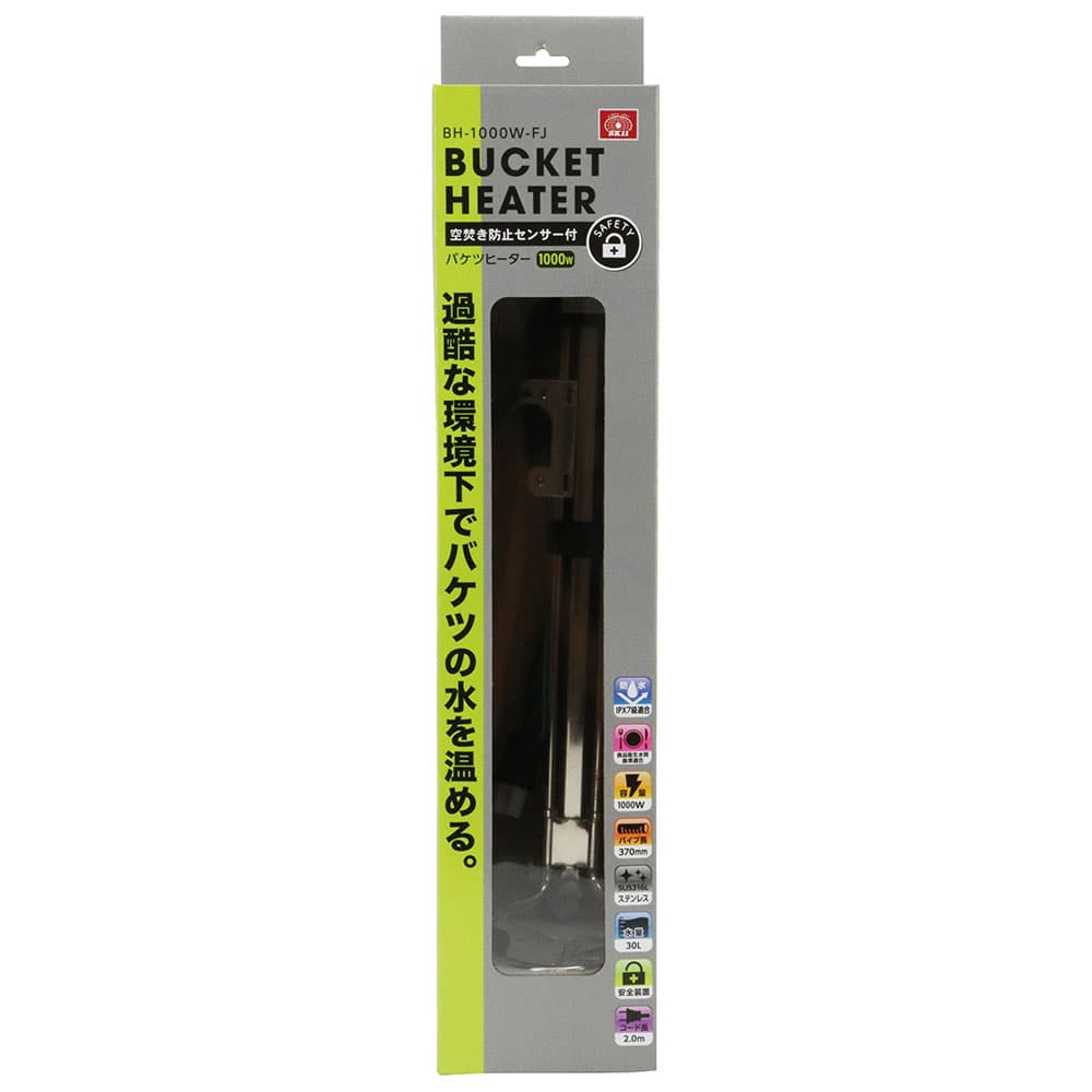 安全・安心。過昇防止センサー付きバケツヒーターです。 内装・土木建築現場、アウトドアレジャー等で、バケツの水を温める電熱式ヒーター。 温度が一定以上になると電源を切る過昇防止センサー付きで空焚きを防止します。 三本脚でバケツの底部にヒーターが接地することを防ぎ、バケツ内での安定感が高くなります。 パイプ部分はステンレス製でサビにくく、お手入れ、保管が楽です。 最低、最高水位線が本体パイプにマークされているため、消えてしまったりはがれてしまう心配がありません。 フック部分は可動式のため、バケツのサイズに合わせて調整が可能です。 ●定格電圧:AC100V(50/60Hz)。 ●消費電力:1000W。 ●最大水量:30L。 ●電源コード:2m(アース線あり)。 ●温度過昇防止装置(空焚き防止)付き。 ●PSEマーク認証。