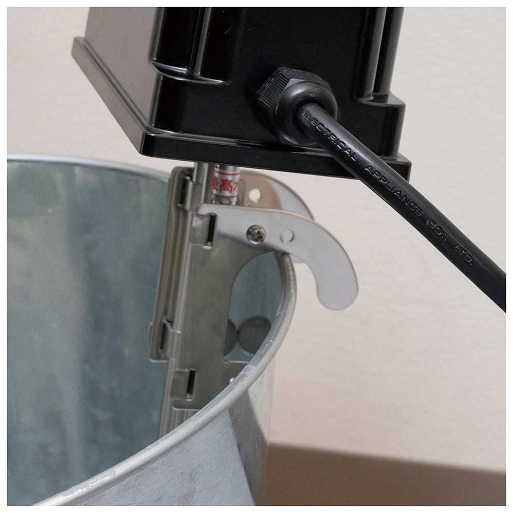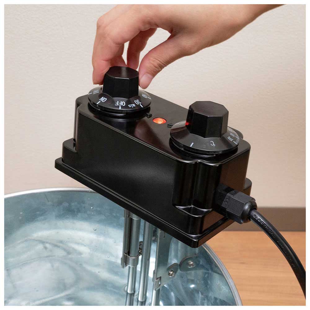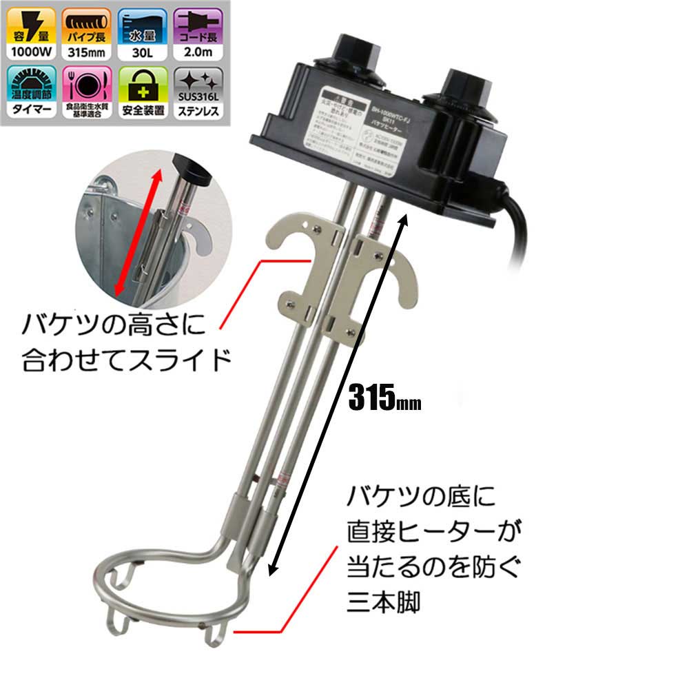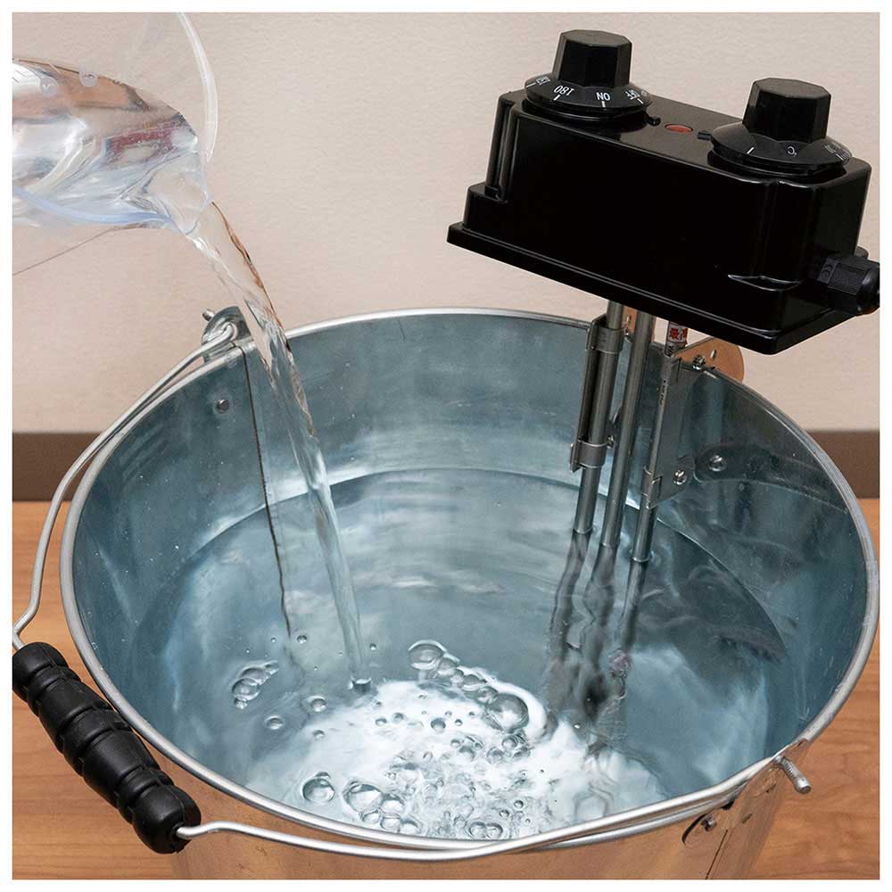 安全・安心、過昇防止センサー、温度調整、タイマー付きの充実装備バケツヒーターです。 内装・土木建築現場、アウトドアレジャー等で、バケツの水を温める電熱式ヒーター。 温度が一定以上になると電源を切る過昇防止センサー付きで空焚きを防止します。 三本脚でバケツの底部にヒーターが接地することを防ぎ、バケツ内での安定感が高くなります。 パイプ部分はステンレス製でサビにくく、お手入れ、保管がラクです。 最低、最高水位線が本体パイプにマークされているため、消えてしまったりはがれてしまう心配がありません。 フック部分は可動式のため、バケツのサイズに合わせて調整が可能です。 ●定格電圧:AC100V(50/60Hz)。 ●消費電力:1000W。 ●最大水量:30L。 ●電源コード:2m(アース線あり)。 ●温度過昇防止装置(空焚き防止)付き。 ●PSEマーク認証。