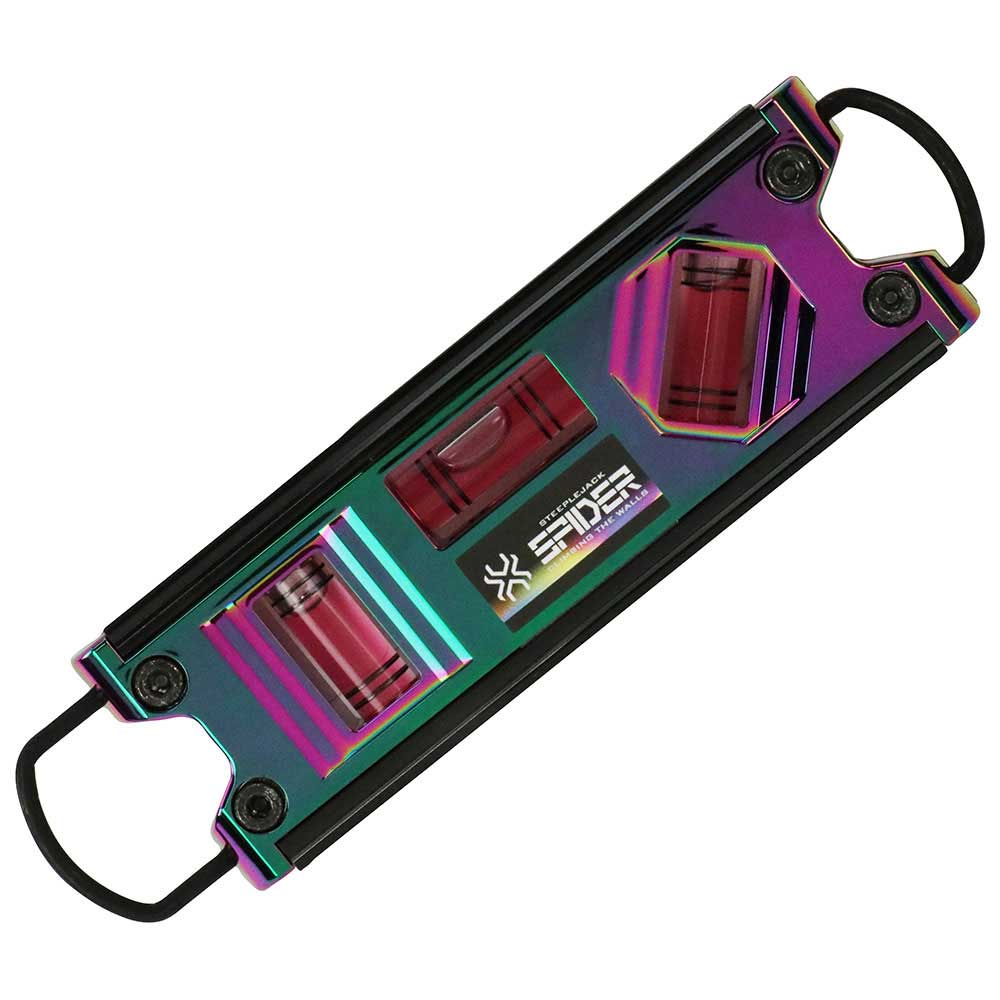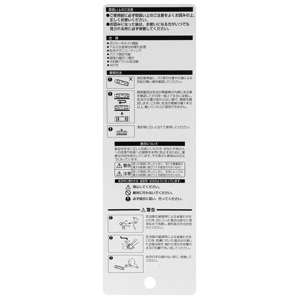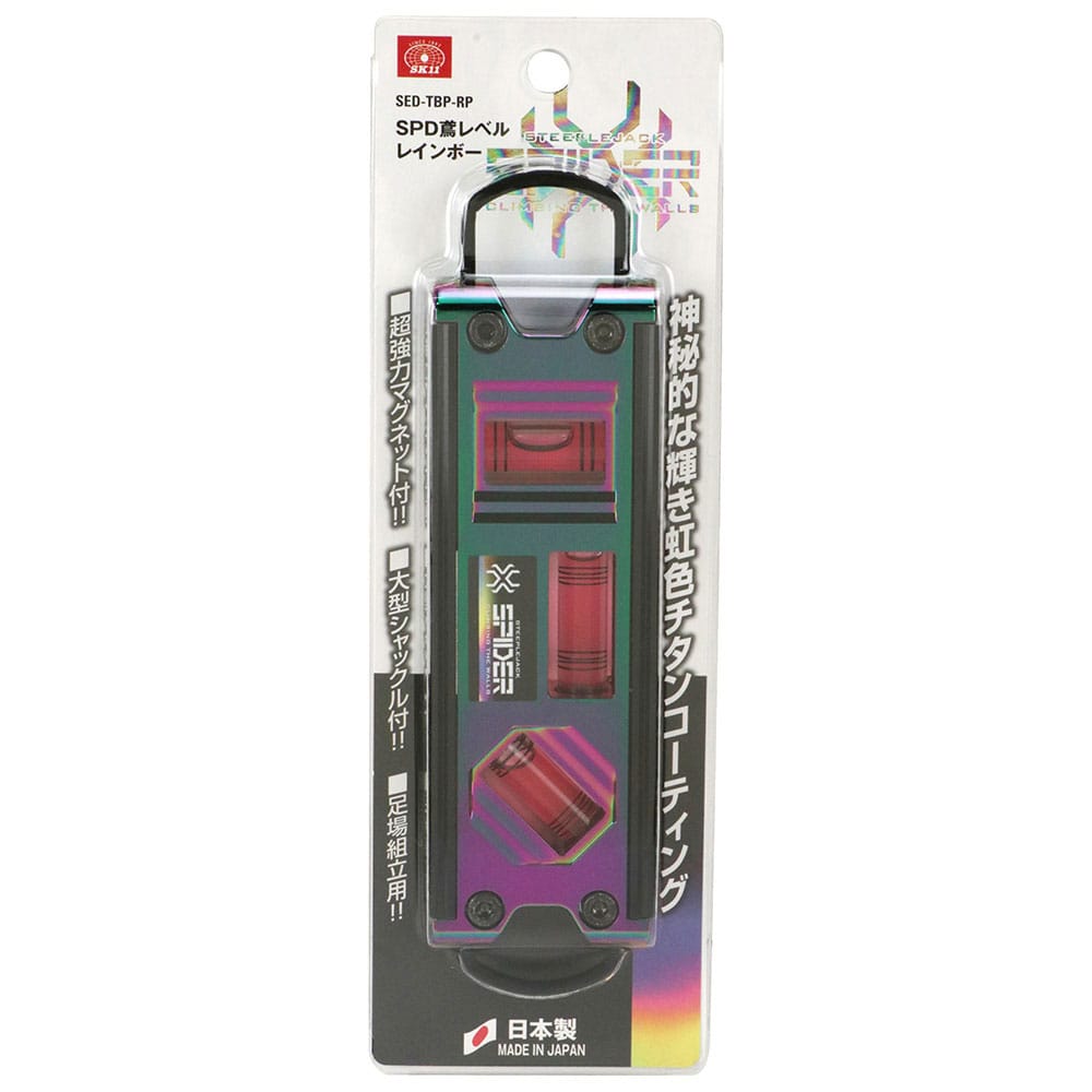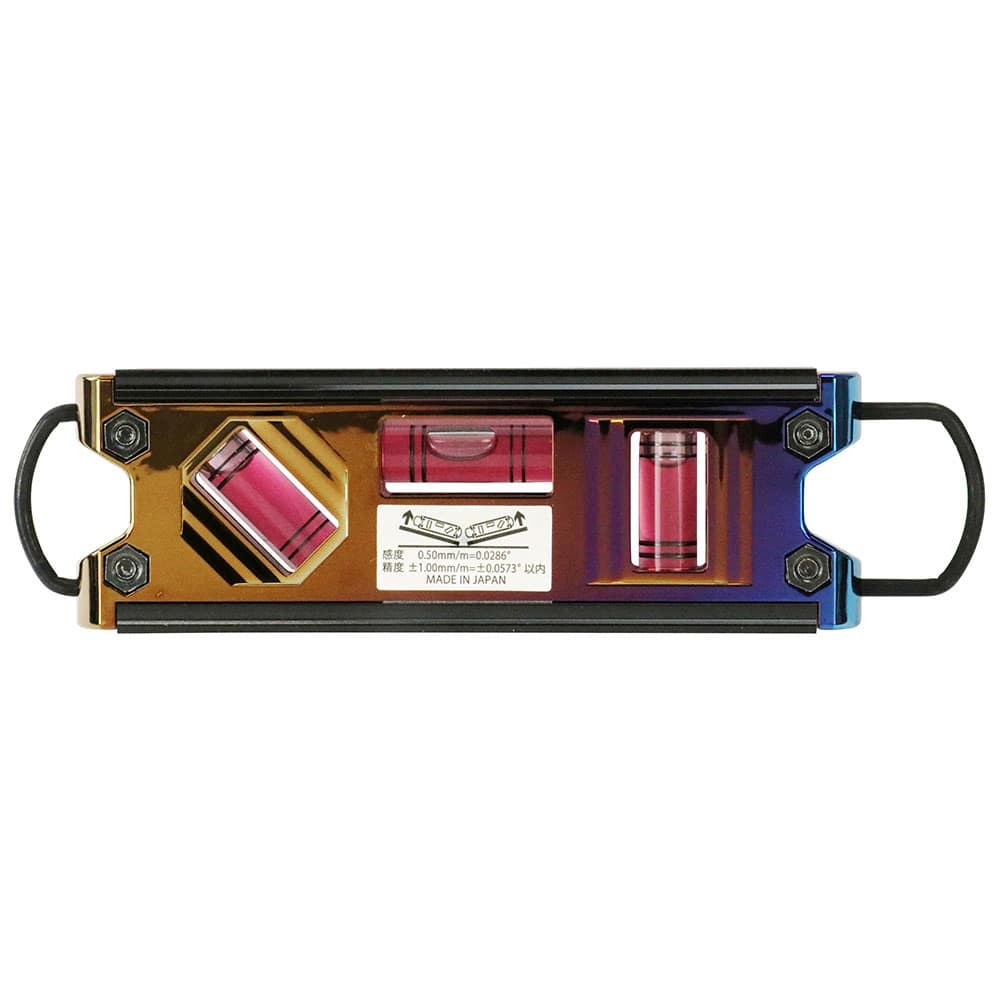 神秘的な輝き虹色チタンコーティングを施しています。 水平・垂直の測定。 足場組立てなどで、水平・垂直の測定に用います。 大型シャックルでカラビナへのスピーディーな収納と取り出しができます。 落下防止コードに対応したシャックルを内蔵しています。 測定基準面がV溝付きでパイプ等が測定できます。 磁石付きで単管工事に便利です。 ●気泡管カラー:レッド。 ●4本線アクリル気泡菅。 ●大型シャックル付き。 ●超強力マグネット付き。