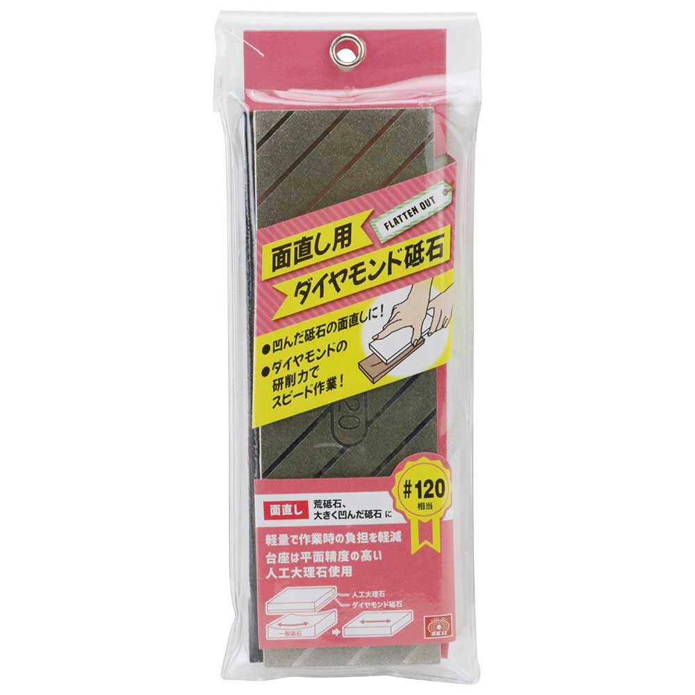 へこんだ砥石の面直しに最適なダイヤモンド砥石です。 刃物を研いだ後の、へこんだ砥石の平面だし作業。 軽量で平面精度の高い人工大理石をベースにすることで、作業負担を減らしながら、精度を高めた面直し作業が行えます。 一般砥石に比べ、摩耗に強く、研削面の修正が不要です。 研削力の高いダイヤモンド砥石のため、作業スピードを速めることができます。 荒砥石、大きく凹んだ砥石に適しています。 ●ダイヤモンド砥材粒度:120相当。 ●本体サイズ:約205×65×10mm。 ●研削面サイズ:約205×65×1mm。