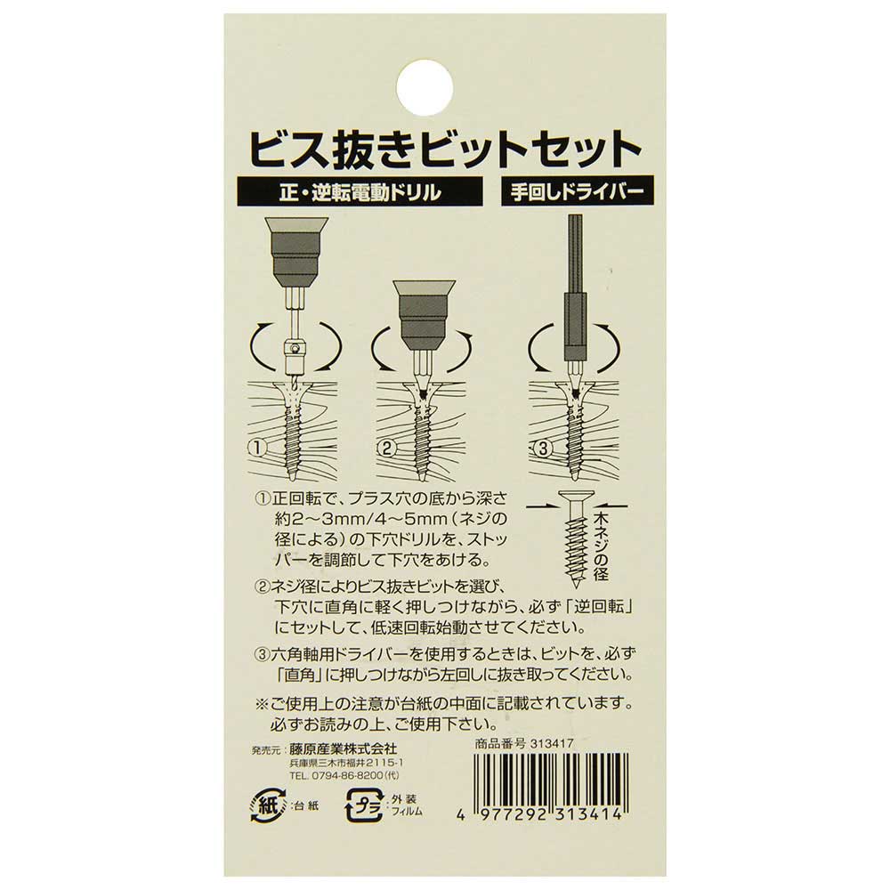つぶれたプラス穴ネジを取り外すことができます。 頭がつぶれたネジ抜き作業(木ネジ専用)。 正回転で下穴をあけ、逆回転で木ネジを抜き取ります。 木ネジ径1.6mm~4.5mmまで対応できるセットです。 ●ビット刻印(1):下穴ドリルサイズ1.0mm・使用できる木ネジのサイズ:径1.6~2.4mm・全長6.3~16mm。 ●ビット刻印(1.5):下穴ドリルサイズ1.5mm・使用できる木ネジのサイズ:径2.4~3.5mm・全長16~32mm。 ●ビット刻印(2):下穴ドリルサイズ2.0mm・使用できる木ネジのサイズ:径3.5~4.5mm・全長32~40mm。 ●適用機種:正逆回転電動ドリル。 ●セット内容:下穴ドリル(1.0・1.5・2.0mm)各1本・ビス抜きビット(1・1.5・2)各1本。