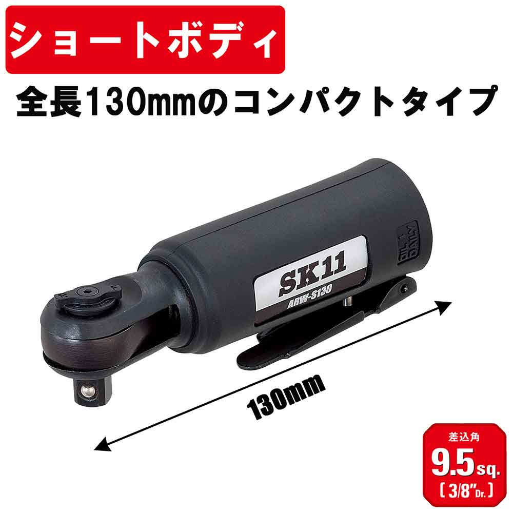 全長130mmのショートボディで狭い場所での作業に最適なミニラチェットレンチです。 機械などの整備・分解やエンジンルーム内のボルトの脱着作業。 カーナビ等のアクセサリーの取り付けにもおススメです。 全長130mmの超コンパクト設計です。 一体型ボディにより、耐久性と強度に優れています。 ●ソケット差込角:9.5mm。 ●能力ボルト径:10mm。 ●最高トルク:40N・m。 ●無負荷回転数:230min-1。 ●全長:130mm。 ●質量:0.5kg。 ●空気消費量:300L/min。 ●空気取入口ねじサイズ:Rc1/4。