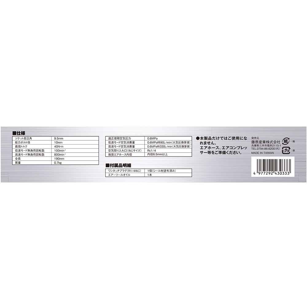 自動車整備、解体作業など、たくさんのボルト、ナットの脱着作業に最適な、高速回転型エアーラチェットレンチです。 ボルト、ナットの締め付け、ゆるめ作業。 回転数切替機能(低速100/高速800回転/分)、正転逆転回転方向切替機能付きです。 最大締付能力:40N/mです。 握りやすく滑りにくい、冷たくなりにくい樹脂製ボディ、ホースのねじれを軽減する回転式空気接続口です。 排気やオイルの噴出が気になりにくい後方排気です。 スロットルレバーの握り加減で速度調整可能です。 ●ソケット差込角:9.5mm、能力ボルト径:10mm、最高トルク:40Nm。 ●無負荷回転数:100(低速モード)、800(高速モード)。 ●空気消費量:90(低速モード)、330L/min(入力空気圧力0.6MPa時)。 ●全長:約190mm、質量:約700g。 ●空気接続口:配管用テーパーメネジ(Rc1/4)。 ●付属品:エアープラグ(R1/4)×1個・エアツールオイル×1個。