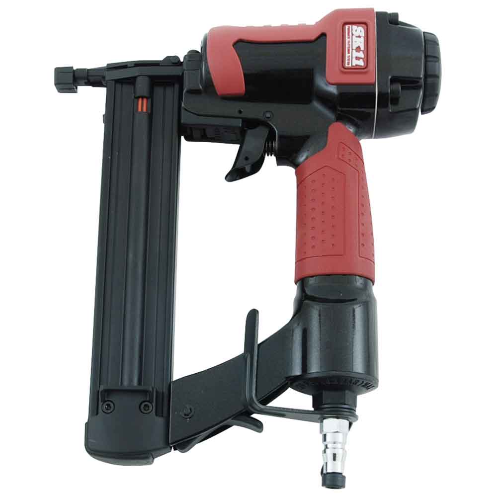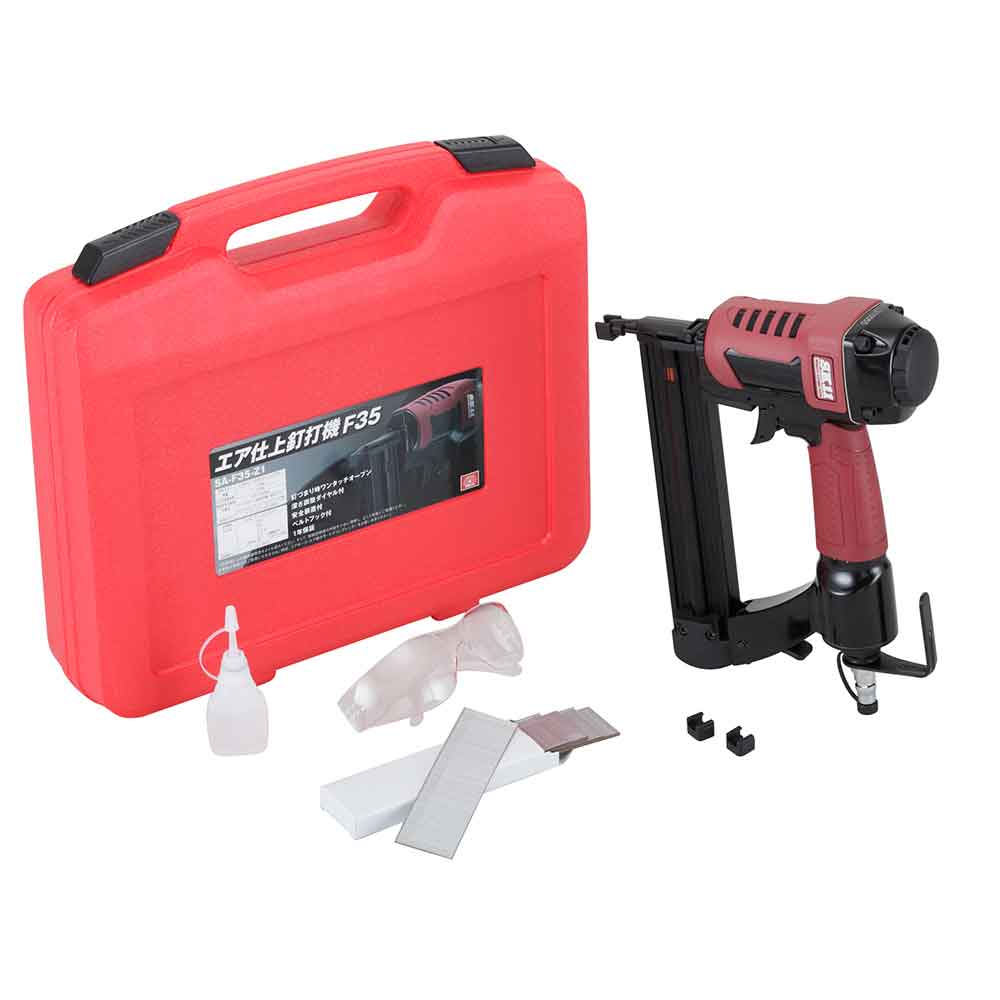 頑丈なダイカストボディのエア仕上釘打機です。 内装仕上部材、化粧合板の取り付け、家具組立て等。 釘づまり時にワンタッチオープンできます。 釘の打込み深さを変えられる、深さ調整ダイヤル付です。 先端を部材に当てないと発射しない安全装置付きです。 ベルトフック付で持ち運びがらくらくできます。 ●本体サイズ:L263XW65XH219mm。 ●重量:1150g。 ●仕上釘装填本数:100本。 ●使用空気圧範囲:0.4~0.8MPa。 ●使用オイル:タービンオイルISOVG32。 ●釘種類:仕上釘(フィニッシュネイル)。 ●釘足長:12~35mm。 ●鋼線太さ:1.05X1.3mm。 ●セット内容:本体・サンプルネイル・安全グラス・ネイラーオイル・ケース・プロテクトケース3個・取扱説明書。