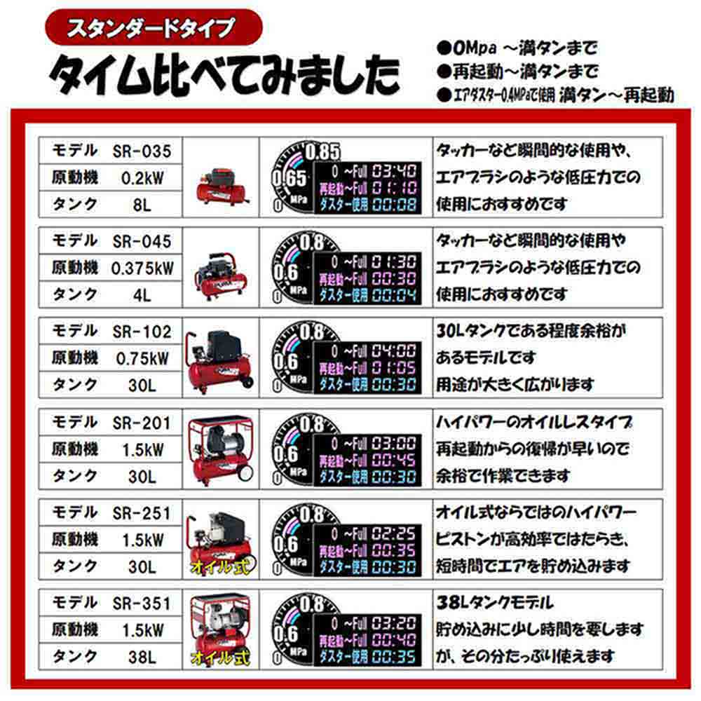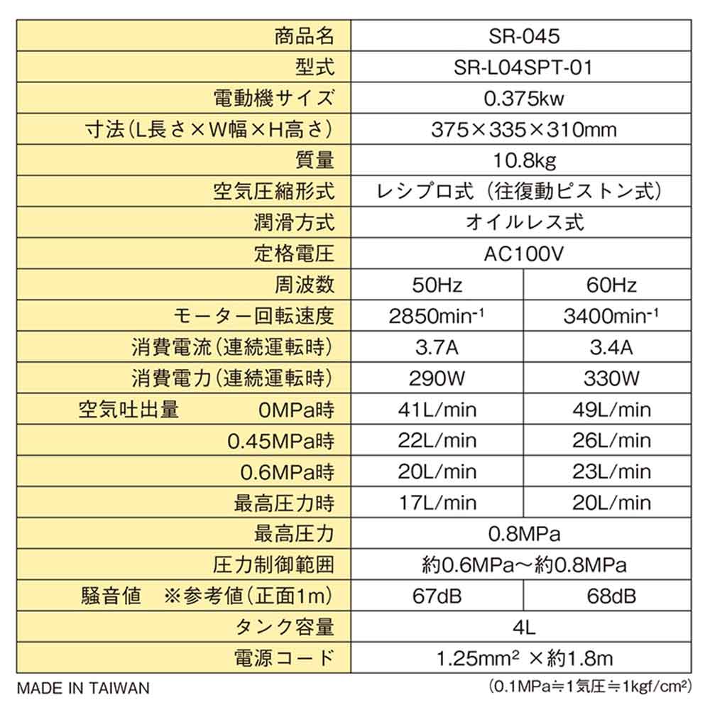 小型軽量でしっかりした吐出量のエアーコンプレッサーです。 タッカー、小型ネイラー、ブラシ、空気入れなど空気消費量が少ない用途。 コンデンサーモーター採用で長寿命です。 ハンドル付きで持ち運びに便利です。 オイル式に比べクリーンなエアーを供給できて安心です。 ボディーカラーは清潔感のあるレッドメタリック塗装でハイクオリティーな作業場になります。 ●電動機サイズ:0.375kW・定格電圧:AC100V。 ●定格周波数:50/60Hz・消費電流:3.7/3.4A。 ●定格消費電力:290/340W・定格時間:連続。 ●空気圧縮方式:レシプロ式(往復動ピストン方式)。 ●圧力制御範囲:0.8-0.6MPa・最高使用圧力:0.8MPa。 ●タンク容量:4L。 ●空気吐出量(L/min):(0MPa時)41/49・(0.45MPa時)22/26・(0.6MPa時)20/23・(最高圧力時)17/20。 ●騒音レベル(参考値)(db(A)/1.5m):67/68。