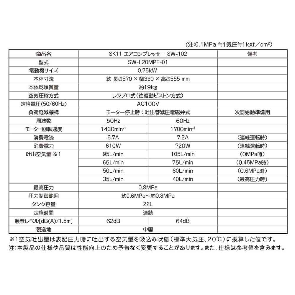 メンテナンス不要のオイルフリー式で作動音が小さい静音エアーコンプレッサーです。 各種空圧工具、空圧機器作動用の空気圧縮機。 オイルを併用しないピストン・シリンダを採用したオイルフリー式なので、オイル量チェックや補充、交換などのメンテナンスがいりません。 ●定格電圧AC100V・周波数50/60Hz・消費電流6.7/7.2A(50/60Hz)。 ●消費電力610/720W(50/60Hz)・電動機サイズ0.75kW。 ●最高圧力0.8MPa・圧力制御範囲0.6~0.8MPa・タンク容量22L・定格時間連続。 ●吐出空気量(50Hz):0MPa時95L/分・0.45MPa時65L/分・0.6MPa時50L/分・0.8MPa時35L/分。 ●吐出空気量(60Hz):0MPa時105L/分・0.45MPa時75L/分・0.6MPa時60L/分・0.8MPa時40L/分。 ●本体質量約19kg・本体寸法長さ約570×幅330×高さ555mm。 ●付属品:タイヤ×2・タイヤ取り付け用ボルト・ナット×各2・ゴム足×1・ゴム足取り付け用ボルト・ナット×各1・フィルター×2。