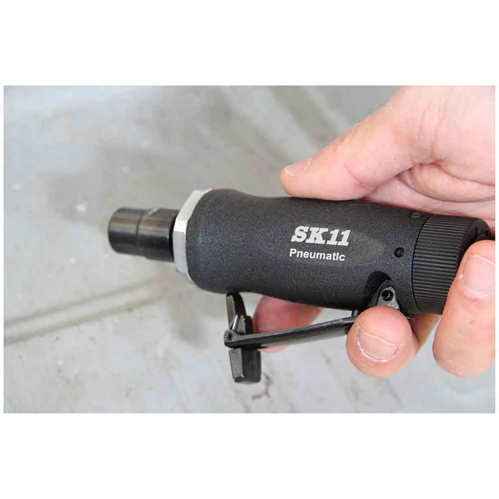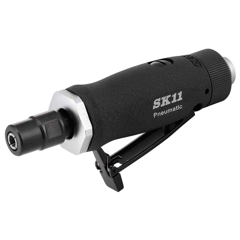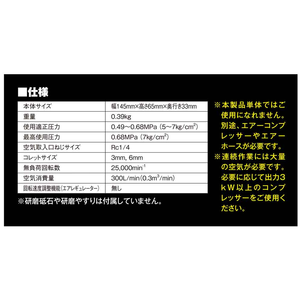 ハードユーザーも安心して使用できる品質と耐久性です。 軸付砥石を使用し細かい部分の研磨作業や金属の加工、バリとりに使用。 6mm軸用と3mm軸用のコレットを付属しています。 流線型ボディーで握りやすく疲れにくいです。 レバーには安全ストッパーが付いており誤動作による事故を防ぎます。 ●6mmコレット及び3mmコレット付属。 ●無負荷回転数:25000min-1・空気消費量:300L/min。 ●最高使用圧力:0.68MPa・エアー取り入れ口ねじサイズ:Rc1/4。 ●エアー取り入れ口ねじサイズ:Rc1/4・常圧汎用ワンタッチプラグ付。 ●エアーレギュレーター(空気流量調整機能)無。 ●本体サイズ:幅145×高さ65×奥行33mm。 ●重量:390g。 ●コレット締め付け、交換用スパナ1セット。 ●付属品:常圧汎用ワンタッチプラグR1/4ねじ・エアーツールオイル。