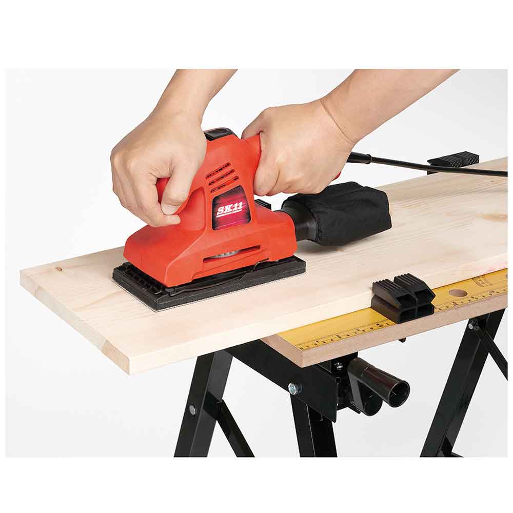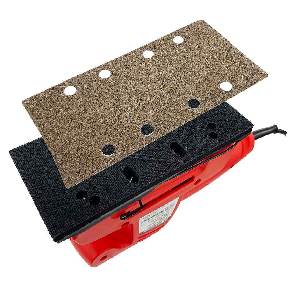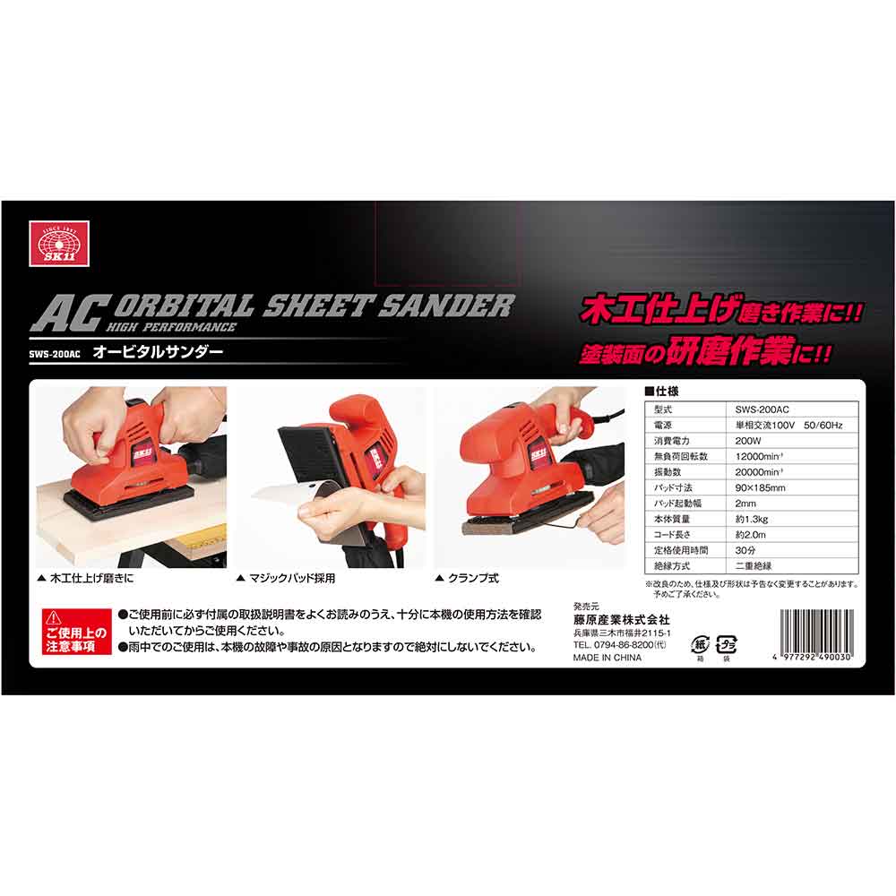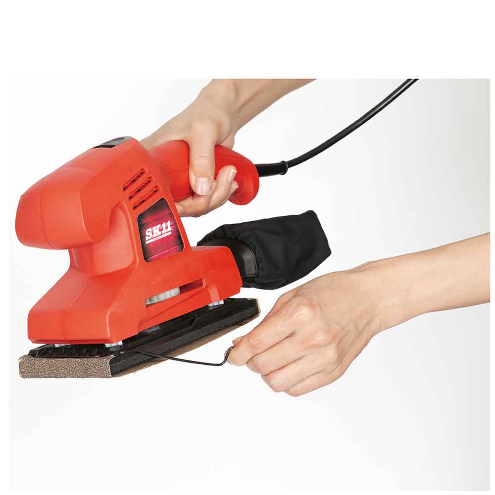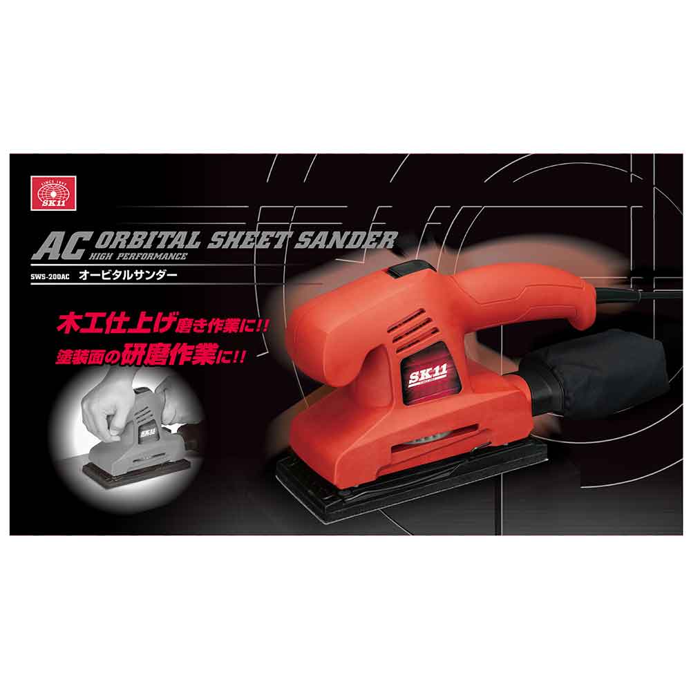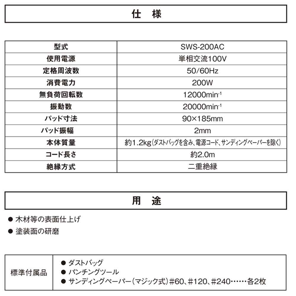 木工仕上げの磨き作業や塗装面の研磨作業に便利なオービタルサンダーです。 木工仕上げの磨き、塗装面の研磨作業。 マジックペーパーを使って取り付けたり、市販のサンドペーパーをクランプで固定可能な兼用タイプです。 本体重量が約1.3kgの軽量タイプで取り回しが楽に行なえます。 シングルファンで振動を軽減しています。 内蔵ファンによりダストバックに自動集塵される機能付きです。 簡単操作のスライドオンスイッチを採用しています。 ●電源:単相交流100V(50/60Hz共用)。 ●消費電力:200W。 ●回転数:12000回転/分・振動数:20000回/分。 ●パッド寸法:92×185mm。 ●パッド起動幅:2mm。 ●絶縁方法:二重絶縁。 ●定格使用時間:30分。 ●コード長:約2.0m。