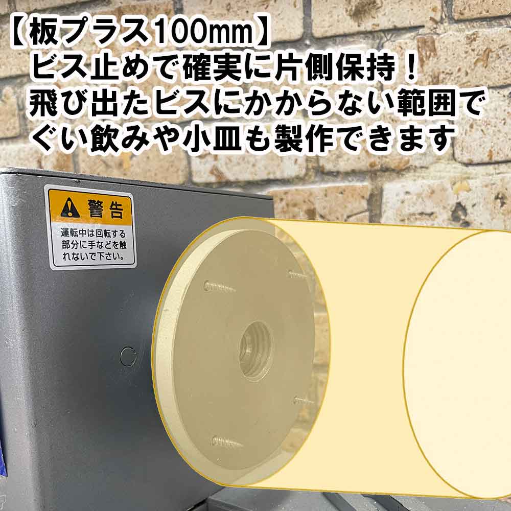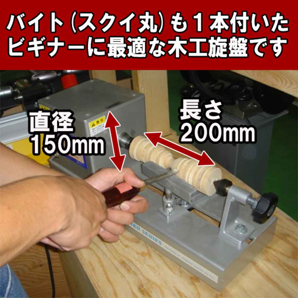 ビギナーに最適な小型木工旋盤です。 各種木・竹の加工茶托・菓子器花瓶・うき・サラダボール・小物入れなどの加工。 小型ながら低速ギアモーター採用で高精度で静音設計の本格派木工旋盤です。 付属の板プラスを使用すれば小径の器の製作も可能です。 別売のスクロールチャックやチャックリングを使えば、お椀や湯のみなどの製作もできます。 オプション/カップリング大(Y2102-1)・小(2102-2)・100mmスクロールチャック(Y2101)・リング3本セット(Y2201)があります。 ●電源:単相交流100V(50/60Hz共用)。 ●電流(50Hz/60Hz):5.5A/4.8A。 ●消費電力(50Hz/60Hz):295W/280W。 ●定格時間:30分。 ●コード長:約2.3M。 ●主軸回転数:(50Hz)1410回転/分・(60Hz)1700回転/分。 ●最大加工寸法:径150mm・長さ200mm。 ●本体サイズ:180×500×230・質量:約15kg。 ●セット内容:100mm板プラス・六角棒レンチ・スパナ2本・主軸三ツ爪・ロックピン・バイト(スクイ丸刃F5521)。