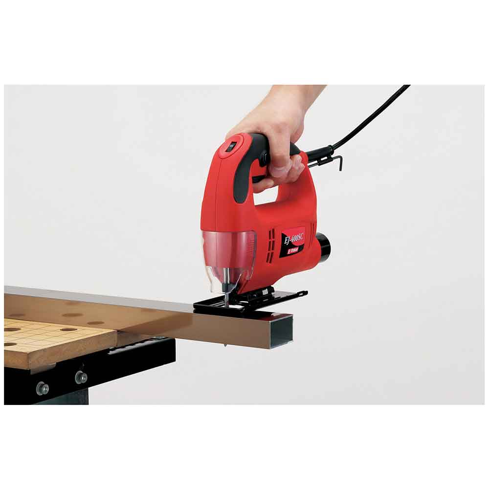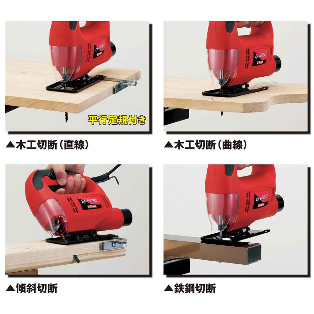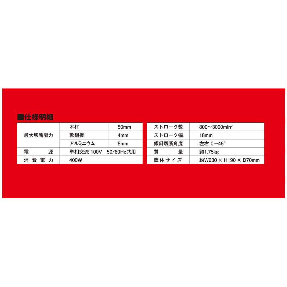 木材・軟鋼板の直線・曲線切断ができるDIYERの必需品です。 木材50mm・軟鋼板4mmまでの直線・曲線切断。 ダイヤル式無段階変速機能で材料に合わせて快適な作業ができ、効率よく作業が出来ます。 切れ味、耐久性にすぐれた世界シェアNO.1のスイス製ブレードが付属しています(T型シャンク)。 市販の丸鋸定規取付可能です。 作動中の振動を軽減するバランサー機能を本体内部に搭載、振動が少なく楽に作業が出来ます。 切粉を吹き飛ばし、墨線を見やすくするブロワー機能付です。 ●電源:単相交流100V(50/60Hz共用)。 ●電流:4.2A。 ●消費電力:400W。 ●最大切断能力:木材50mm・軟鋼板4mm・アルミニウム8mm。 ●ストローク数:800~3000回/分・ストローク幅18mm。 ●傾斜切断角度:左右0~45度。 ●電源コード長:2.0m。 ●絶縁方式:二重絶縁。