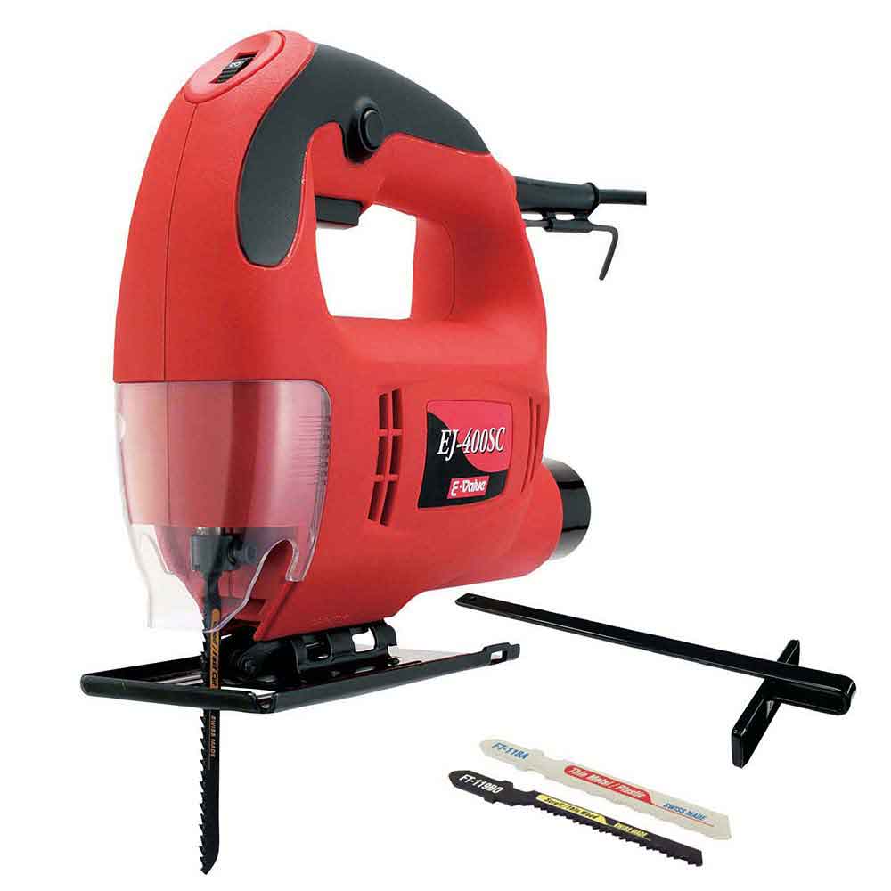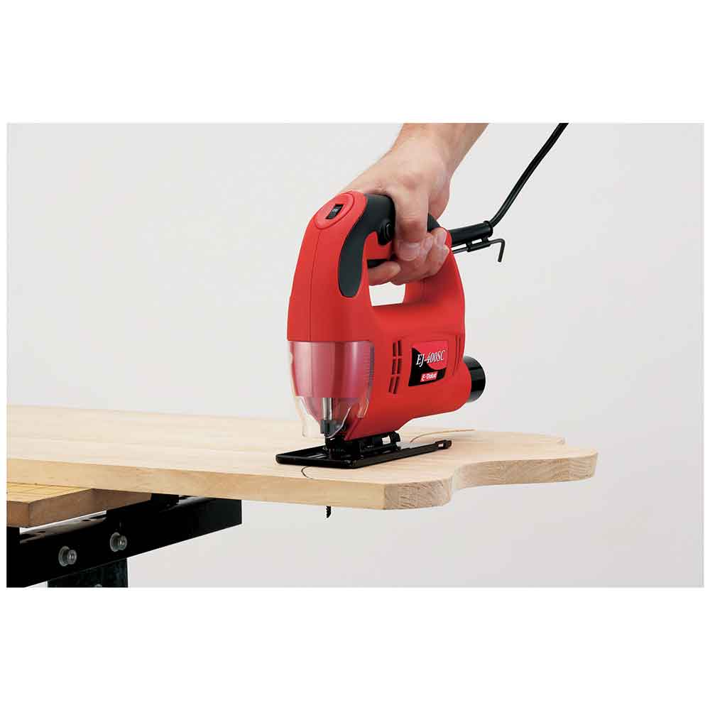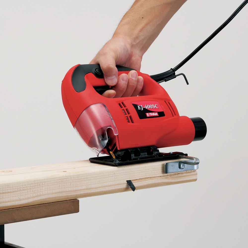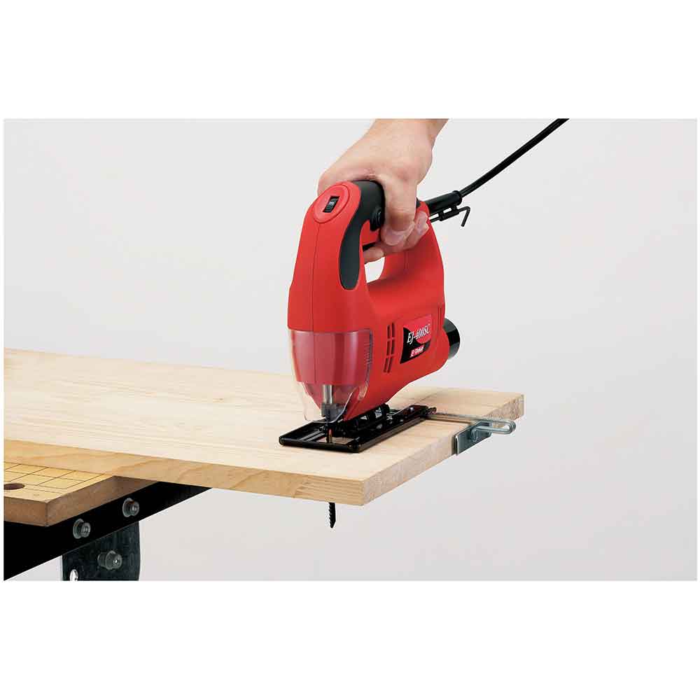木材・軟鋼板の直線・曲線切断ができるDIYERの必需品です。 木材50mm・軟鋼板4mmまでの直線・曲線切断。 ダイヤル式無段階変速機能で材料に合わせて快適な作業ができ、効率よく作業が出来ます。 切れ味、耐久性にすぐれた世界シェアNO.1のスイス製ブレードが付属しています(T型シャンク)。 市販の丸鋸定規取付可能です。 作動中の振動を軽減するバランサー機能を本体内部に搭載、振動が少なく楽に作業が出来ます。 切粉を吹き飛ばし、墨線を見やすくするブロワー機能付です。 ●電源:単相交流100V(50/60Hz共用)。 ●電流:4.2A。 ●消費電力:400W。 ●最大切断能力:木材50mm・軟鋼板4mm・アルミニウム8mm。 ●ストローク数:800~3000回/分・ストローク幅18mm。 ●傾斜切断角度:左右0~45度。 ●電源コード長:2.0m。 ●絶縁方式:二重絶縁。