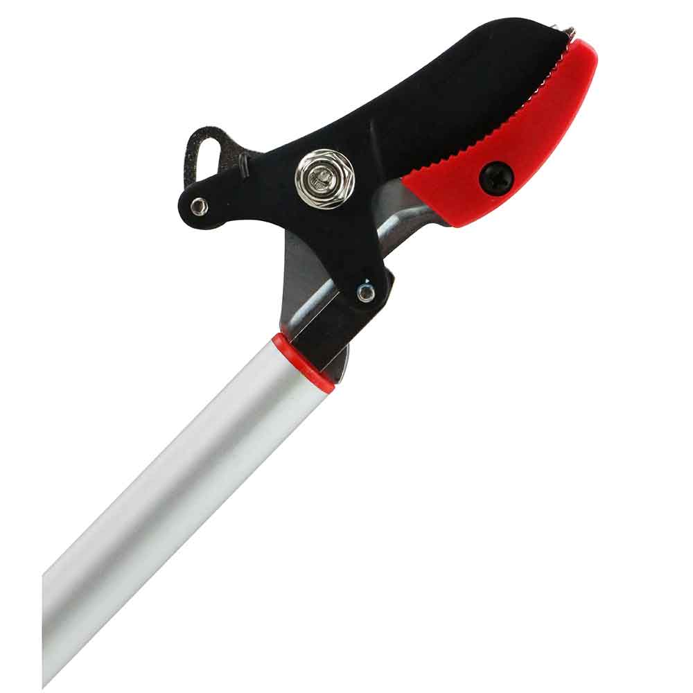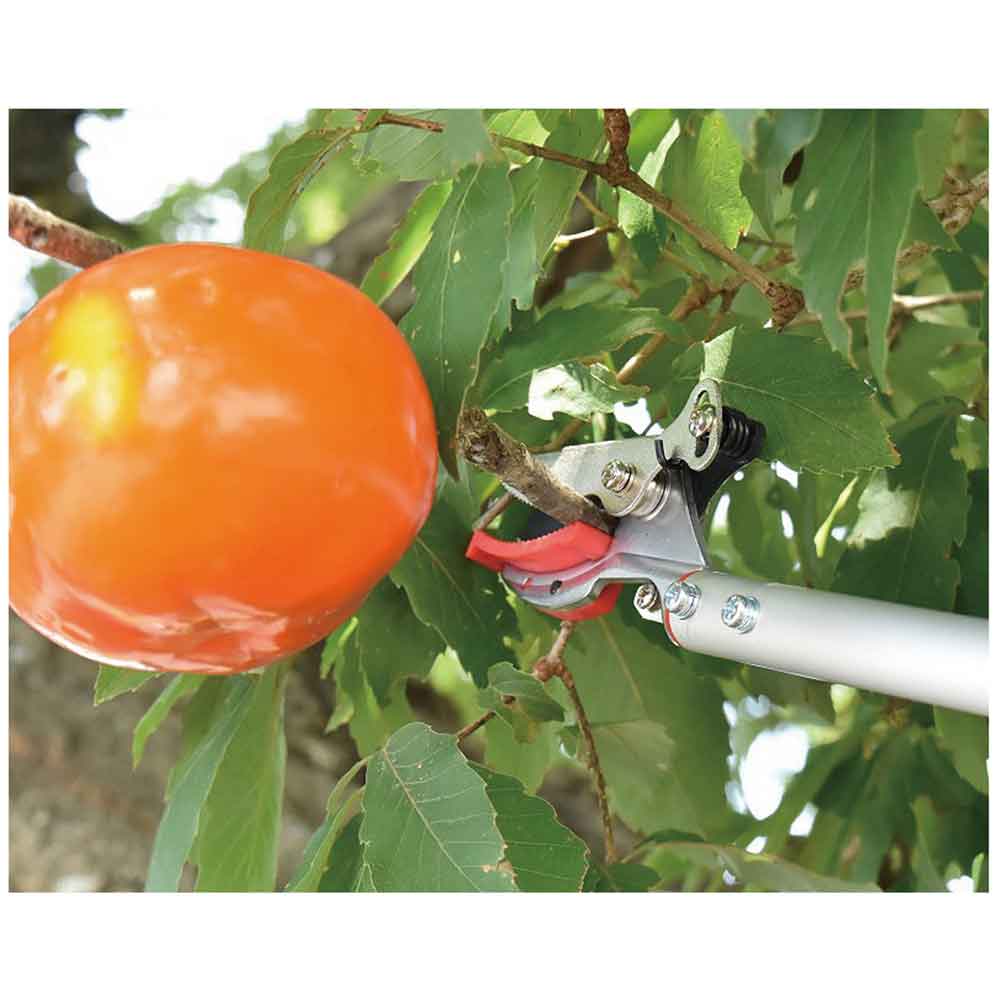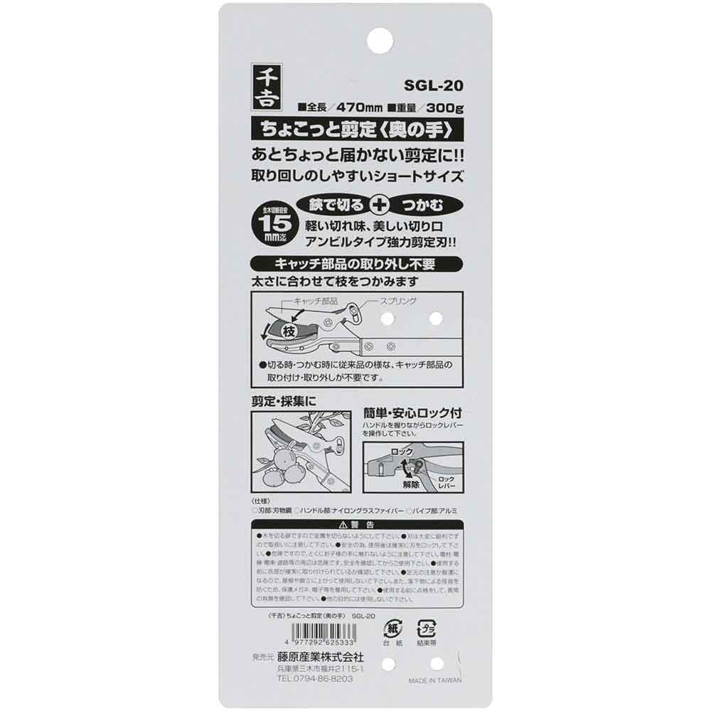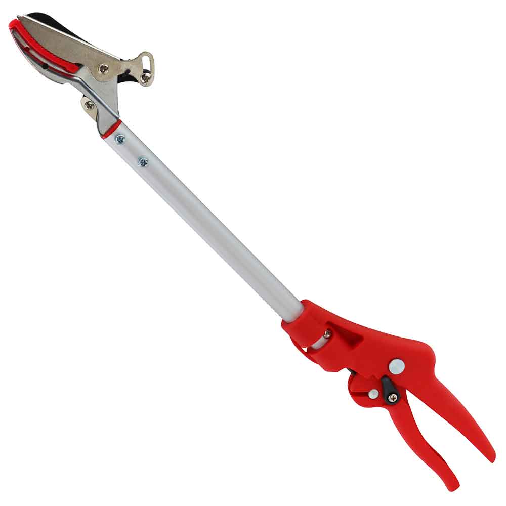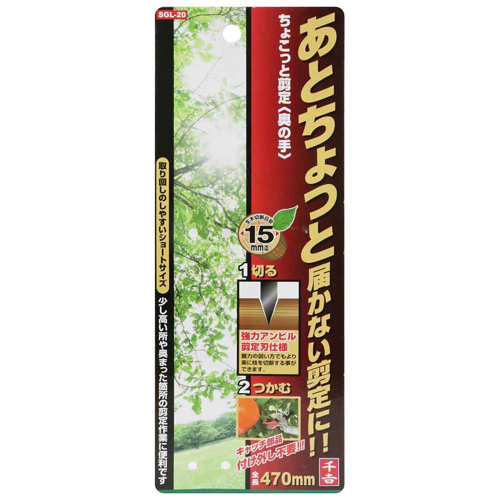 あと少し届かない箇所の剪定作業に便利です。 剪定・整枝作業。 全長47cmで抜群の取り回しで、剪定鋏では届かない少し高い所や、奥まった場所の剪定作業に便利です。 アンビル刃タイプで切れ味抜群です。 ハサミで切って掴みます。 簡単・安心ロック付きです。 ●アンビル刃タイプ。 ●全長:470mm。 ●重さ:約300g。