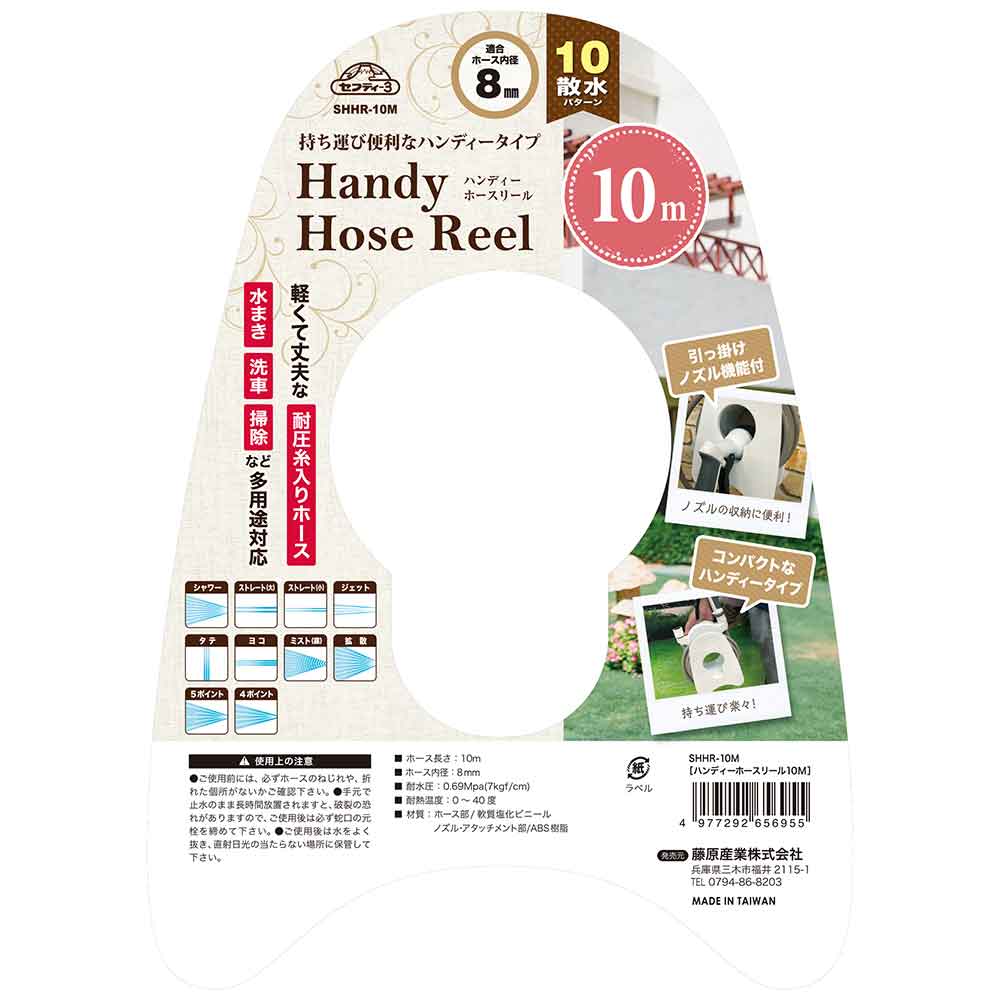 持ち運び便利なハンディータイプのホースリールです。 水まき・掃除・洗車など多用途対応の散水ホースリール。 水まき・掃除・洗車など多用途対応の散水ホースリールです。 収納に便利な引掛けノズル機能付です。 ノズルは10パターンでシャワー・ストレート大・ストレート小・タテ・ヨコ・ミスト・ジェット・5ポイント・4ポイント・拡散です。 軽くて丈夫な耐圧糸入りホースです。 ●ホース内径:8mm。 ●耐水圧:0.69Mpa(7kgf/cm)。 ●耐熱温度:0度~40度。 ●ホース長さ:10m。