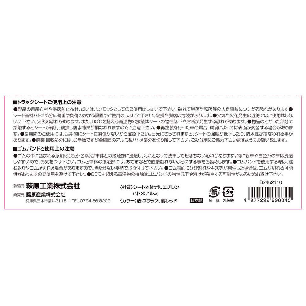 前方からの雨水侵入を防ぐ前垂れ付き軽トラックシートです。 荷物の落下防止や、悪天候等への荷物の濡れを防止。 荷物の落下や悪天候等による劣化を防ぐ為に軽トラックの荷台にかけます。 前垂れとトラックマットとを併用することでシート前方からの雨水の侵入を防ぎます。 弊社エステル帆布トラックシートと比較して約50%軽量です。 ●シート本体寸法:1900mm×2150mm。 ●シート前垂れ寸法:1520mm×900mm。 ●ゴムバンド:15mm幅×10m(1本入)。 ●カラー:(表)ブラック、(裏)レッド。 ●山張りタイプ。