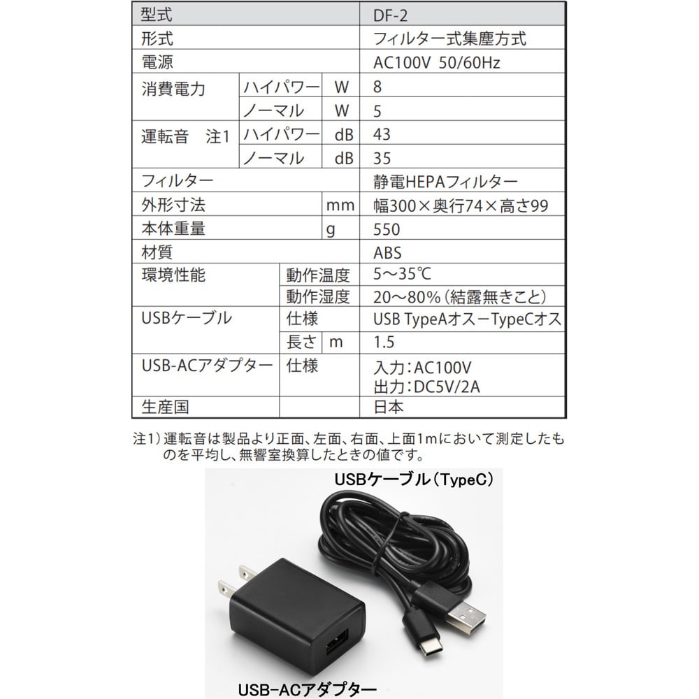 ●ダブルファンでマイクロ飛沫を3方向からパワフルに吸引します。●0.3ミクロンを超える微粒子を99.92%除去できる高性能フィルター搭載です。●卓上に置けるコンパクトサイズです。●高い静音性があります。●色:黒●電源(V):単相100●消費電力(W)(50/60Hz):8●幅(mm):300●奥行(mm):74●高さ(mm):99●標準消費電力料金(50Hz):0.24円/h●標準消費電力料金(60Hz):0.24円/h●本体寸法(mm)高さ:74●本体寸法(mm)奥行:99 質量550g