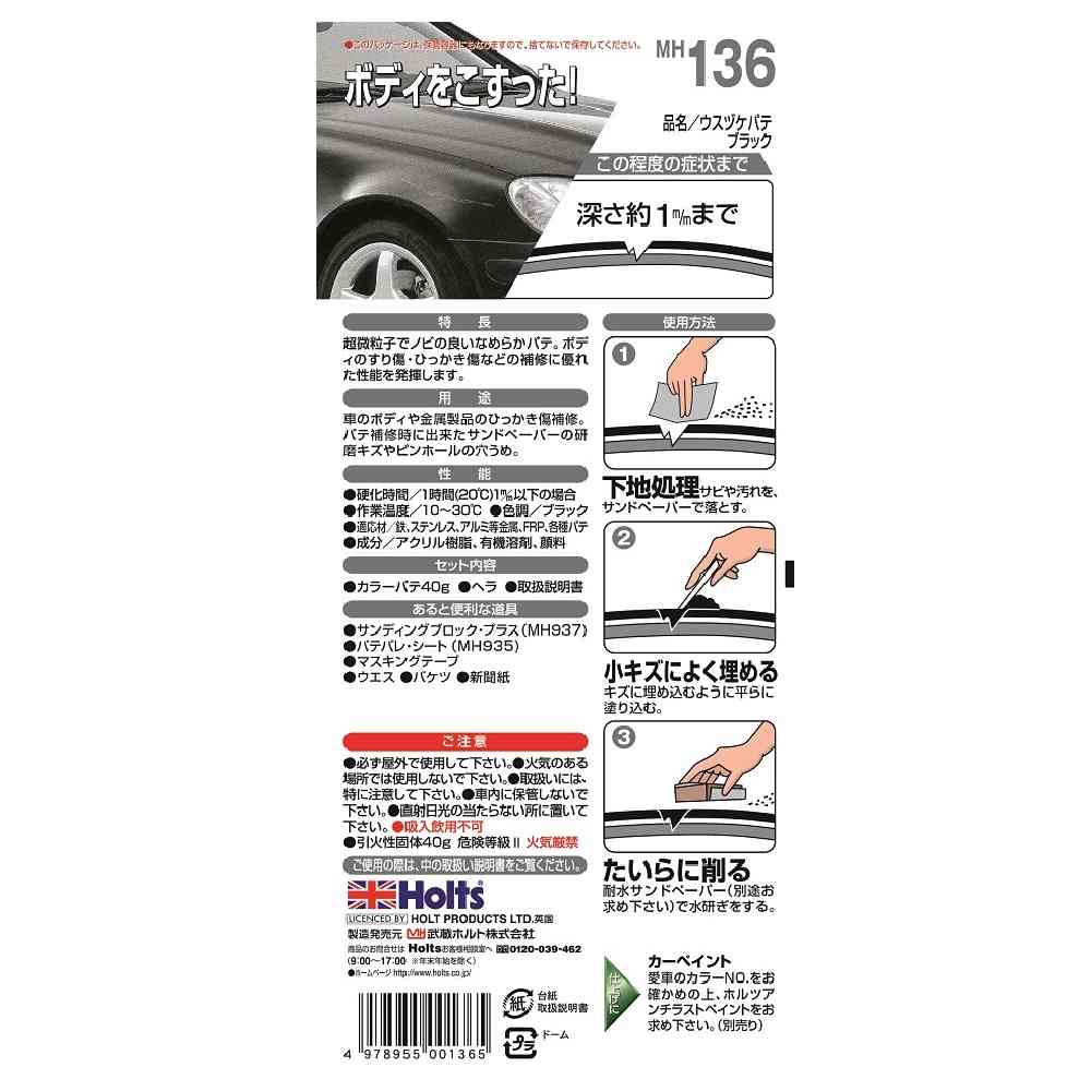 超微粒子でノビの良いなめらかパテ。 ボディのすり傷・ひっかき傷などの補修に優れた性能を発揮します。