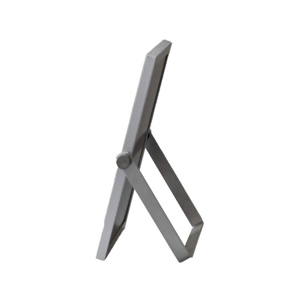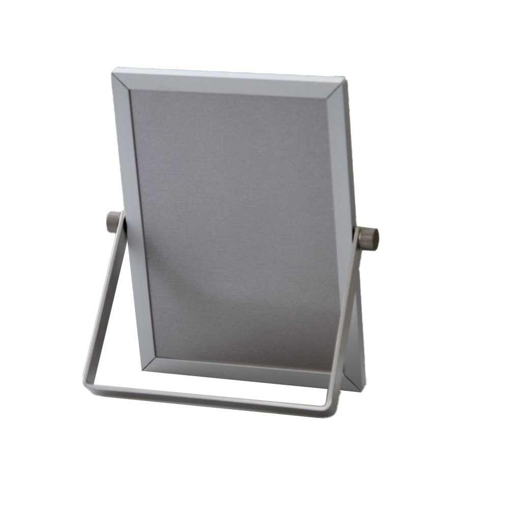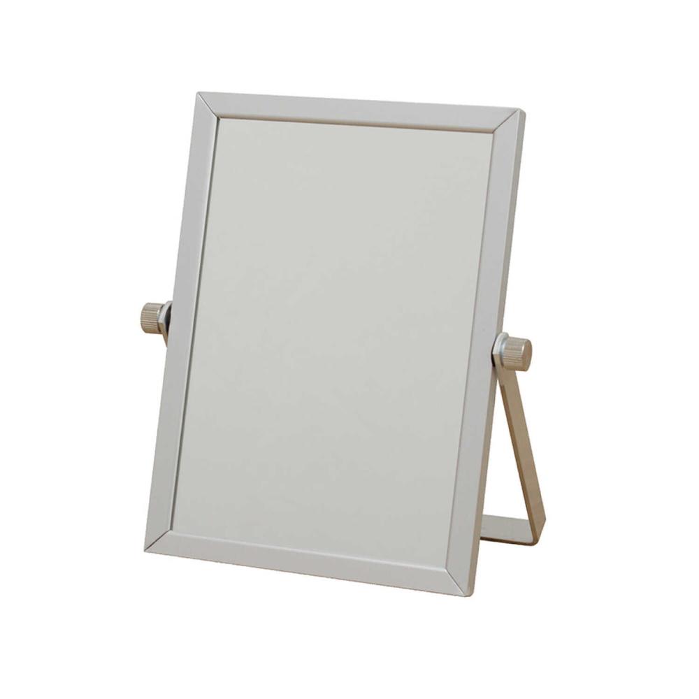 スタイリッシュなアルミ製フレームを使用したシルバーのスタンドミラー。 足の開きを変えることで鏡の角度を調整出来ます。 卓上鏡としては小さめサイズなので会社のデスクに置いても、お出かけに携帯してもいいミラーです。 足のネジが緩んでも手で締めることが出来るのもいいところです。