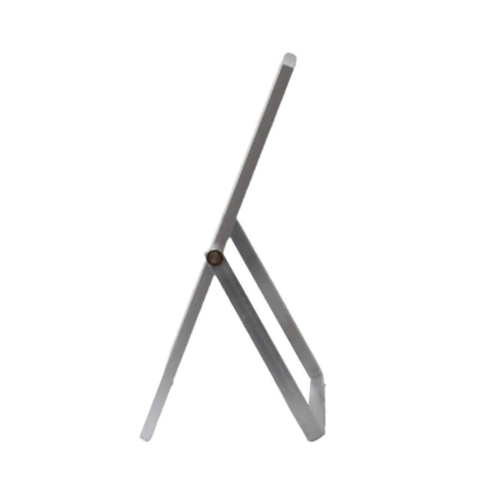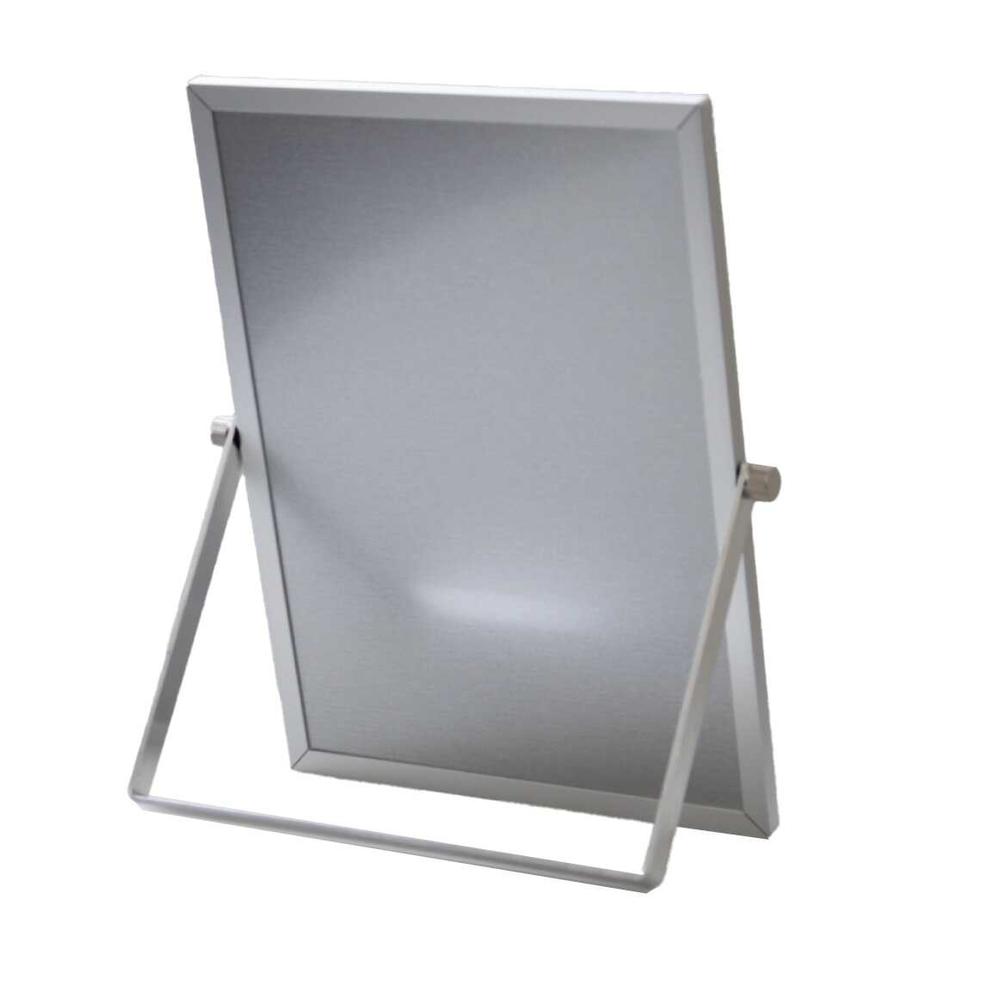 スタイリッシュなアルミ製フレームを使用したシルバーのスタンドミラー。 足の開きを変えることで鏡の角度を調整出来ます。 卓上鏡としては小さめサイズなので会社のデスクに置いても、お出かけに携帯してもいいミラーです。 足のネジが緩んでも手で締めることが出来るのもいいところです。
