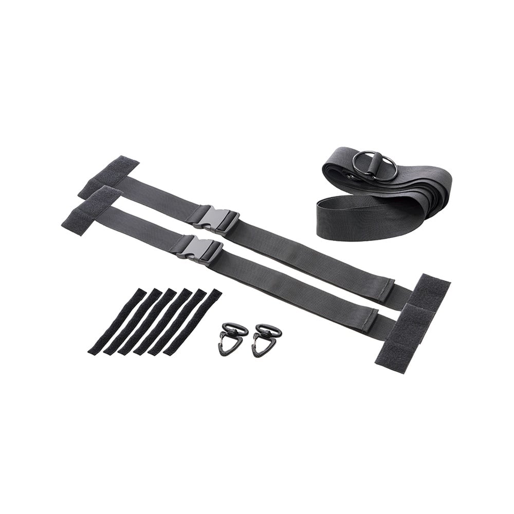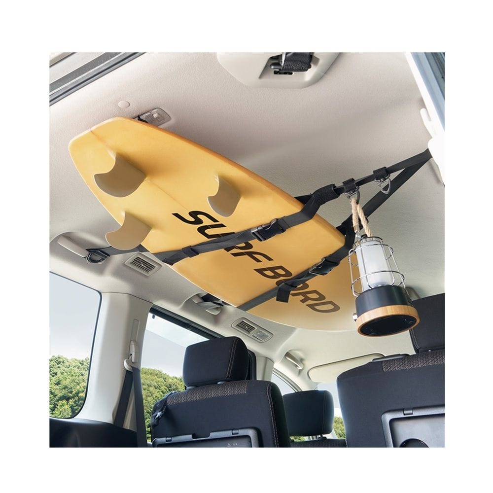 ●3箇所(前後左右)のアシストグリップを利用して取り付けるハンギングベルトです。 ●サーフボード等の長尺物を積載&小物等を吊るして収納できます。 ●安定した積載を可能にする50mmの幅広ベルトを採用しています。 ●積載物のすべりや跳ねを軽減するストッパーベルト付きです。 ●小物を吊り下げできるカラビナ(2個)付きです。 ●ベルトを簡単に強く張ることができる金属製のDカンを採用しています。 ●耐荷重:7kg