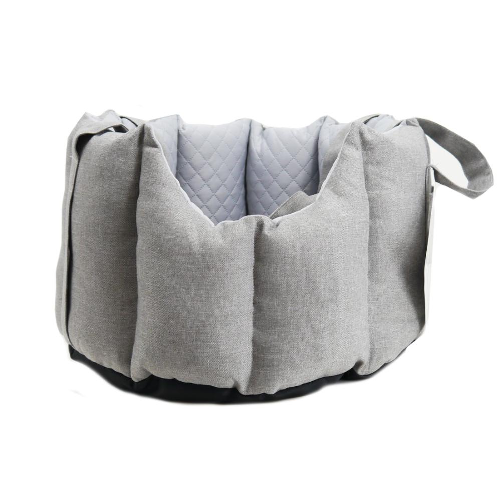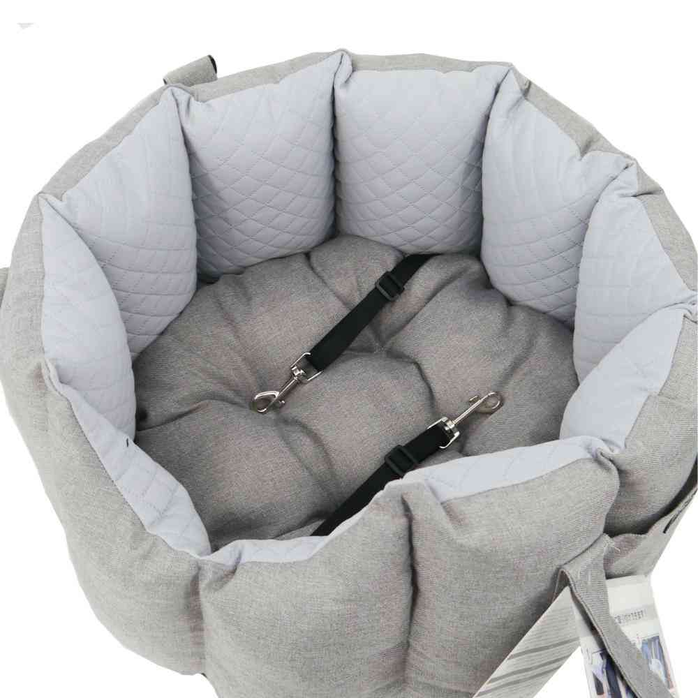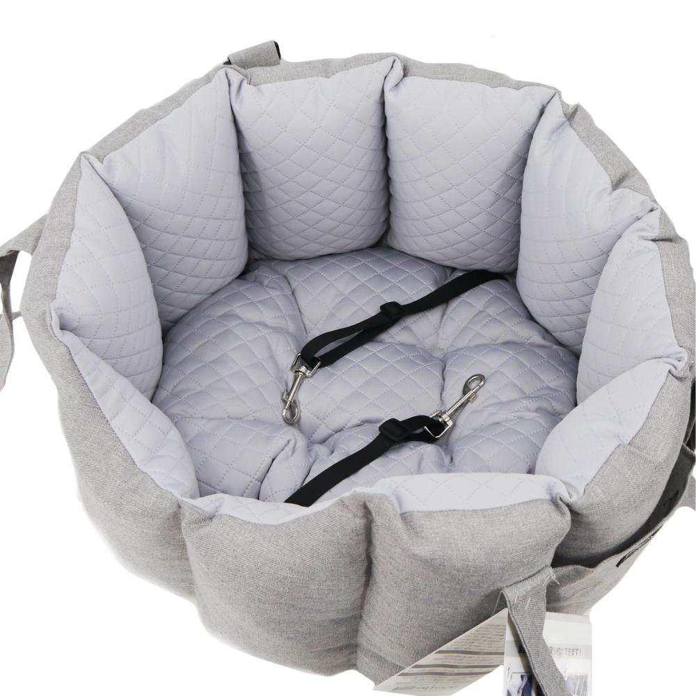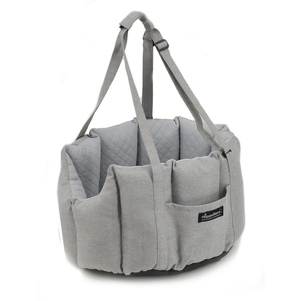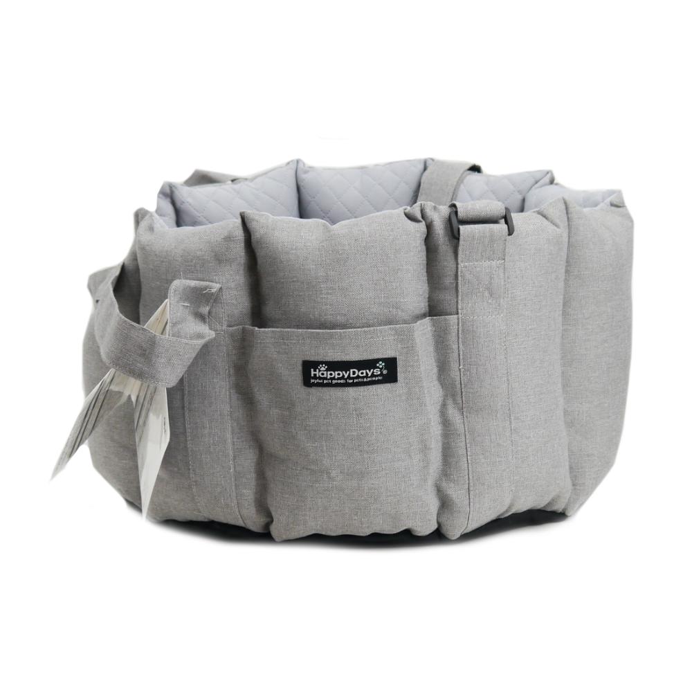・家から車、お出かけ先までこれ一つでOK!ドライブベッドにキャリーバッグの機能をプラスしました。 ・ベルトの長さは調節可能で持ちやすい長さに合わせることができます。 ・シートへの固定はヘッドレストとシートベルトの2点で行うので安全。車の助手席に乗せた際にペットの顔が見えるようになっています。 ・飛び出し防止リードは2本付きで2頭飼いの方にもおすすめ。 ・中のクッションはリバーシブルなので、季節に合わせて使用できます。 ・車に置いても、服装にも合わせやすいシックなカラーです。 ・ベルトを持ちやすく束ねるパーツ付き、収納ポケット付き。 ●耐荷重:6kg
