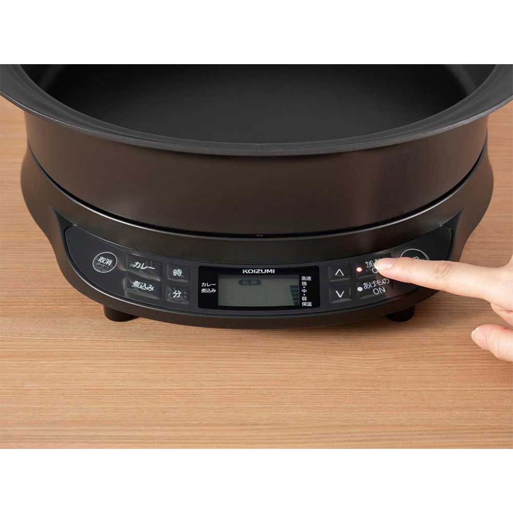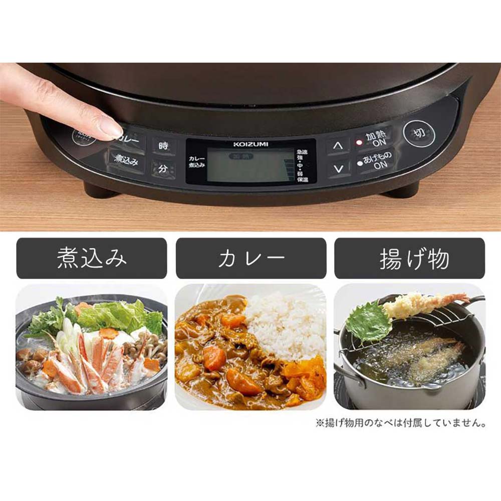 ●電源:100V 50/60Hz ●消費電力:1400W (急速加熱時・専用なべ使用時) ●揚げ物調節:7段階(約140~200C) ●加熱モード:6段階(保温あり) ●タイマー:1分~9時間55分 ●安全装置:自動OFF機能/温度過昇防止/回路保護機能/切り忘れ防止機能/電流ヒューズ ●コードの長さ:約1.9m ●サイズ:約357(W)×283(D)×195(H)mm(専用なべ含む) ●質量:約3.8kg(専用なべ含む) ●付属品:電源コード、専用なべ
