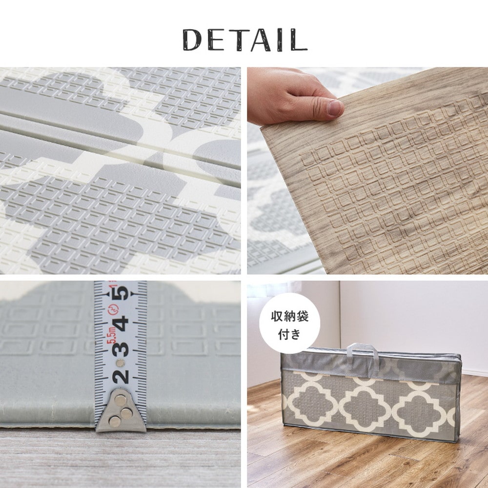 サッとひと拭き、お手入れ楽々。クッション性があり、子供の遊び場にもおすすめなクッションプレイマット。使わない時は折りたたんで収納も簡単。マットがぴったり入る収納袋付き。裏面は木目柄になっていてリバーシブル使用も可能です。