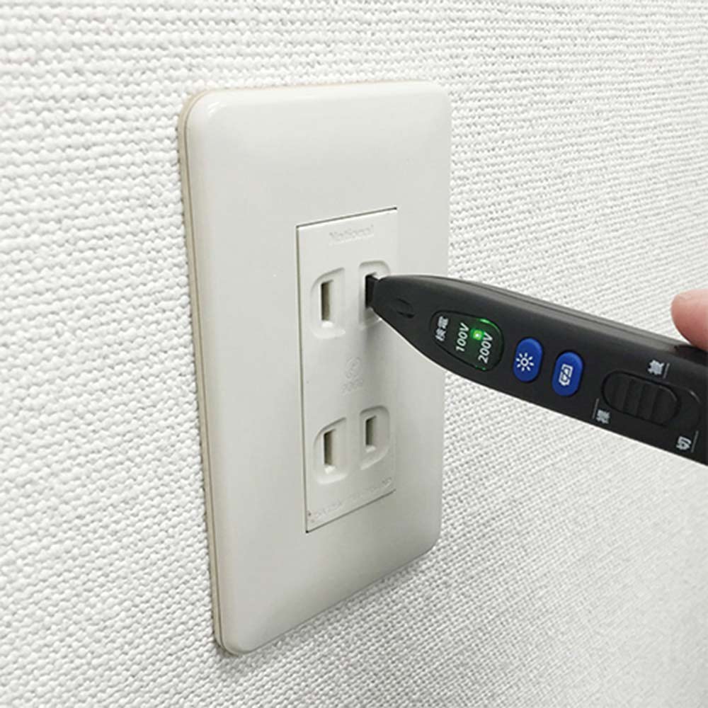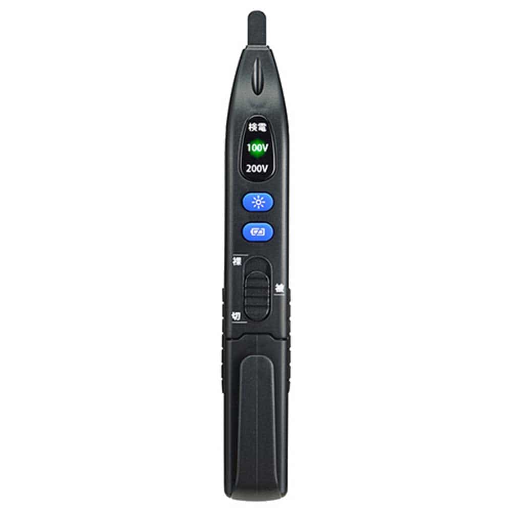 非接触式(AC)と接触式(AC/DC)の通電状況を簡単操作でチェックするペンサイズの検電器です。 AC、DCの通電チェック。 AC、DCの検電ができる両用モデルです。 被覆の上からと直接検電ができます。 非接触式測定時に感度調節が可能なボリューム付きです。 AC/DC、100/200Vの電圧判別機能付きです(接触式測定時のみ・接地の状態が不安定な場合は正確な電圧判別が出来ません)。 暗所で便利なLED照明機能付きです。 ●使用温湿度:0~+40度C・75%RH以下(結露がないこと)。 ●保存温湿度:-10~+50度C・75%RH以下(結露がないこと)。 ●電源:LR44ボタン電池×2個。 ●サイズ(約):W17.5×H132×D18mm・重量24g(電池含む)。 ●校正:不可。 ●接触式AC検電検出範囲:7~1000V(50~60Hz)。 ●非接触式AC検電検出範囲:30~1000V(50~60Hz)。 ●接触式DC検電検出範囲:5~1000V。 ●付属品:取扱説明書。