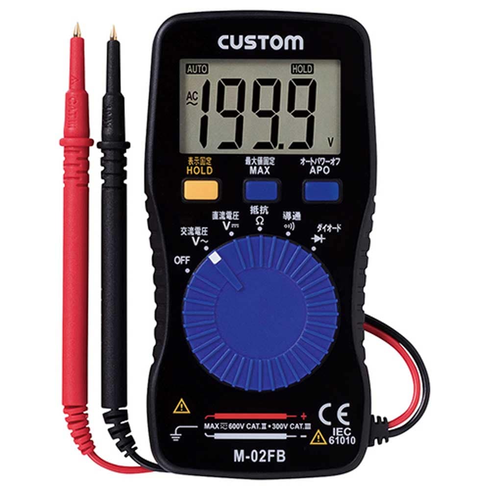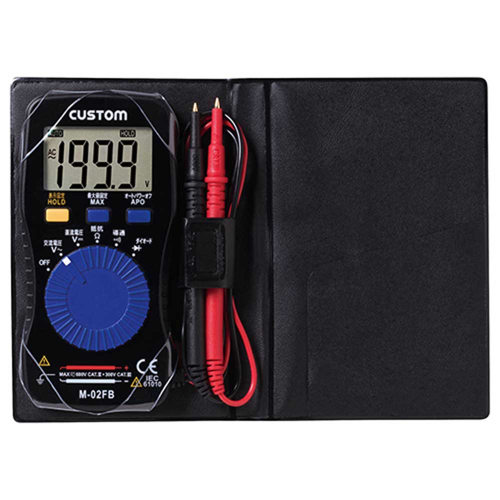 薄型の手帳サイズのデジタルマルチメータです。 機器などの電圧、抵抗測定。 導通チェックはブザーとLEDでお知らせしますので、騒音の大きい現場でも一目で確認できます。 電池の消耗を防ぐオートパワーオフ機能を搭載しています。 測定値を固定する表示固定(HOLD)機能、測定値を最大値で固定する最大値固定(MAX)機能があります。 ●動作原理:二重積分方式。 ●サンプリング:約3回/秒。 ●電源:CR2032リチウム電池×1個。 ●サイズ(約):W56×H112×D11mm・重量70g(電池含む)。 ●校正可・準拠規格IEC-61010-01_300V_CAT.III_600V_CAT.II。 ●レンジ/分解能:DCV(200mV/0.1mV・2V/0.001V・20V/0.01V・200V/0.1V・600V/1V)・ACV(2V/0.001V・20V/0.01V・200V/0.1V・600V/1V)。 ●レンジ/分解能:Ω(200Ω/0.1Ω・2kΩ/0.001kΩ・20kΩ/0.01kΩ・2MΩ/0.001MΩ・20MΩ/0.01MΩ)。 ●付属品:取扱説明書・手帳型ケース。