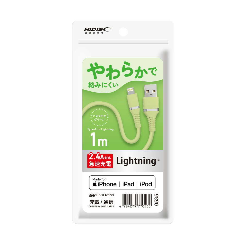 ケーブル、シリコン、からまない、グリーン、緑、1m、ライトニング、iPhone、アイフォン、Lightning