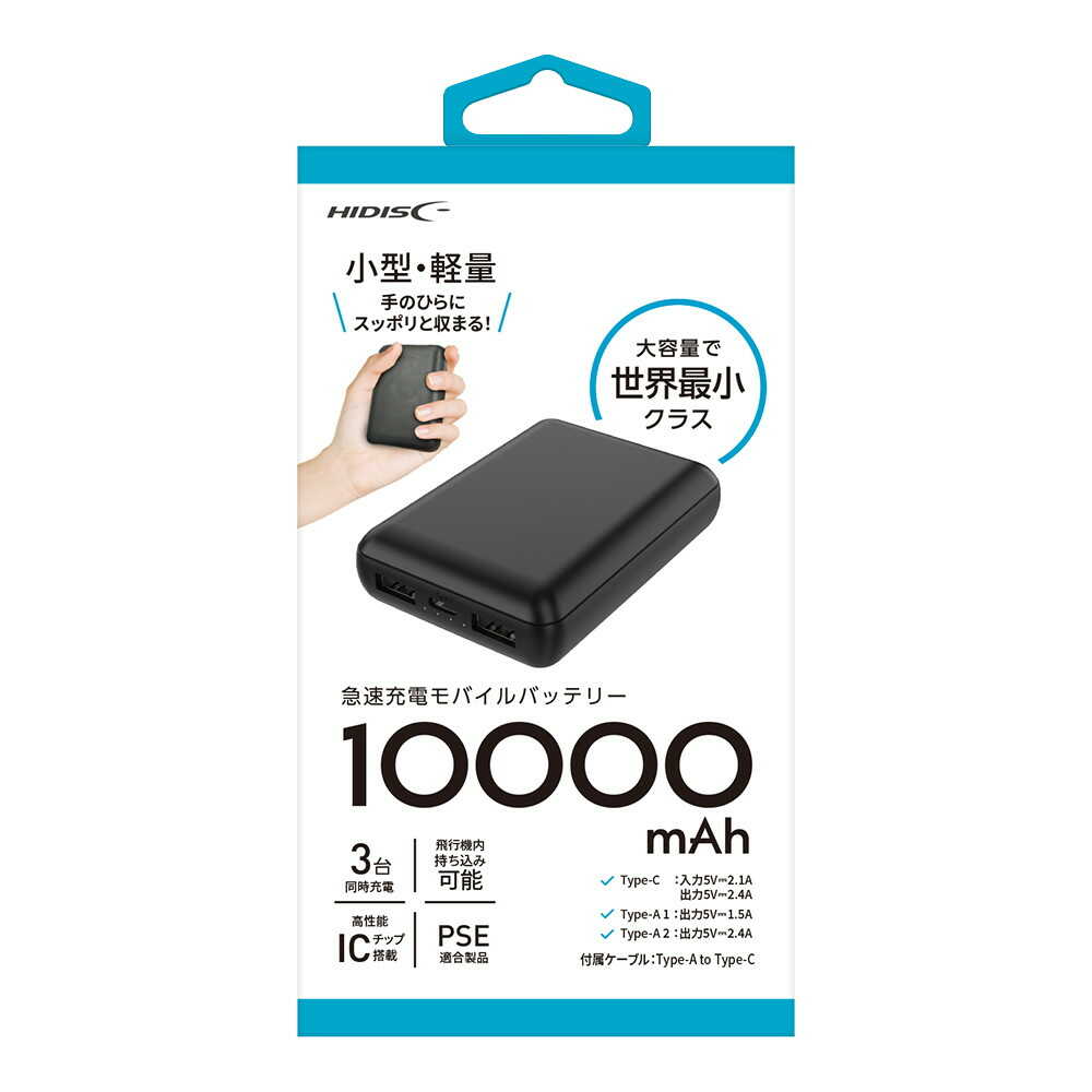 10000mAh、モバイルバッテリー、バッテリー、ブラック、黒、軽量、小型、コンパクト、高性能ICチップ