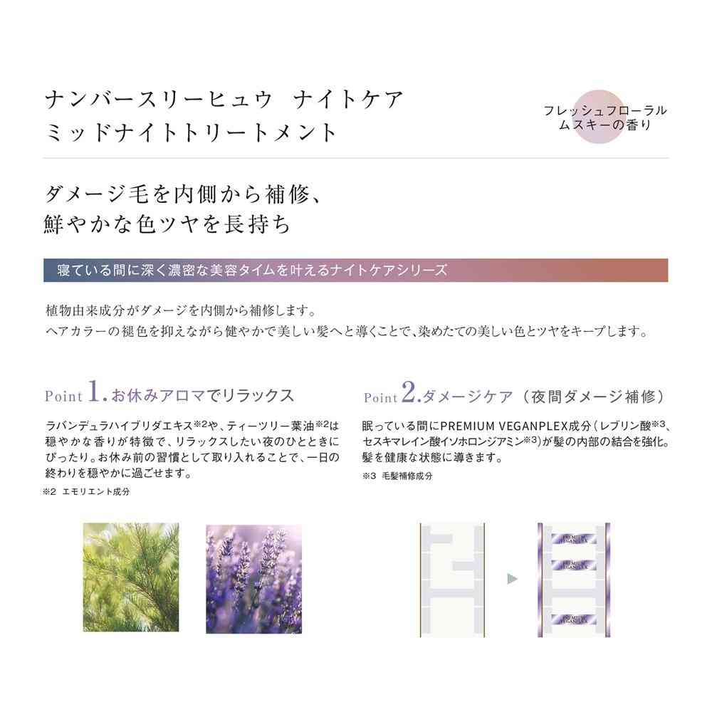 優眠美容/夜、眠るだけで美しく。 寝ている間に深く濃密な美容タイムへ導く、ヒュウナイトケアシリーズ。 睡眠中に髪を乾燥や摩擦から守り、補修成分が浸透。 翌朝の寝ぐせやダメージをケアします。 忙しく朝のケアに時間をかけられない方に最適です。 【ミッドナイトトリートメントの特徴】 髪になじみやすいクリームでダメージを内側から補修。 髪に潤いを与え、美しい色とツヤをキープ。 【香り:フレッシュフローラルムスキー調の香り】 上質なホワイトリリーを基調に、瑞々しいスイートオレンジやネロリ、ラベンダーを加えてアレンジ。 甘さと爽やかさのある安らぎの香りが、やさしく眠りに導きます。