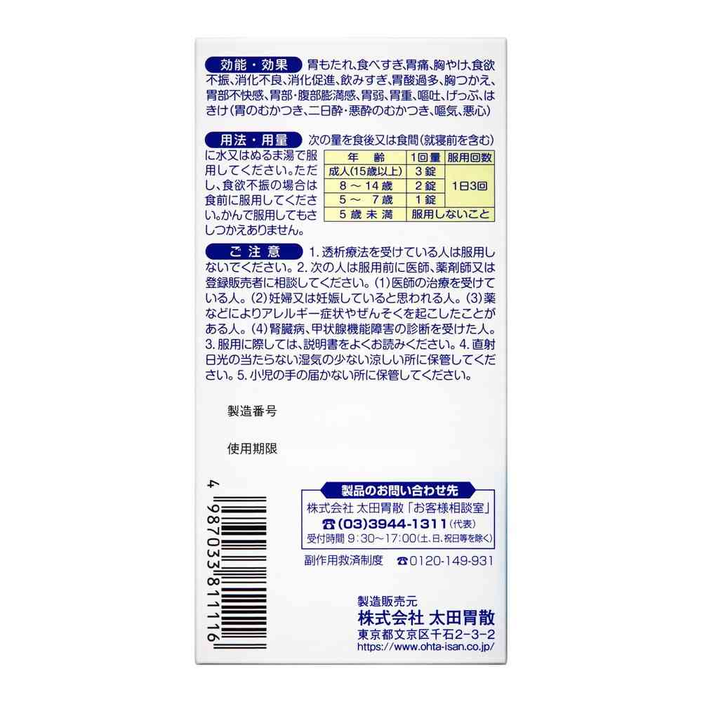 ・消化のよいものを食べ、暴飲暴食に気をつけましょう。 ・お使いになって何か気になる症状が出た場合は、使用を中止し、医師・薬剤師・登録販売者にご相談下さい。 ・使用前に、よく添付文書をお読みになってからご使用下さい。 ・その際、ご不明な点がございましたら、薬剤師・登録販売者にご相談下さい。商品説明●太田胃散A<錠剤>は、胃の中の脂肪分を分解することによって胃に対する負担をやわらげ、不快な症状を改善する胃腸薬です。