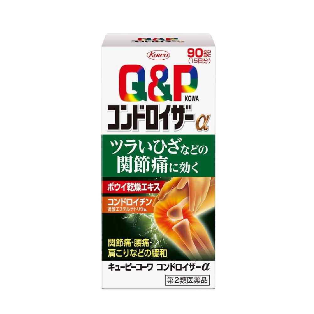 ・痛みの場合、つらい時は無理して動かさないよう気をつけましょう。部位によってはサポーターなども併用すると良いでしょう。 ・(関節痛・筋肉痛)痛みが無ければ、軽い運動をしましょう。 ・使用してもよくならなかったり、症状がだんだん強くなってくる場合は、受診することをお勧めします。 ・1ヶ月ほど使用しても改善が見られない場合、お使いになって軟便、下痢等何か気になる症状が出た場合は、使用を中止し、医師・薬剤師・登録販売者にご相談下さい。 ・使用前に、よく添付文書をお読みになってからご使用下さい。その際、ご不明な点がございましたら、薬剤師・登録販売者にご相談下さい。商品説明キューピーコーワコンドロイザーαは関節・神経の働きに効果のあるビタミンB1をはじめとした有効成分に,鎮痛・抗炎症作用のある生薬ボウイ,関節軟骨の構成成分であるコンドロイチン硫酸エステルナトリウムを配合し“今ある痛み”に働きかけ,ツラいひざなどの関節痛・神経痛に効果をあらわしていきます。 ■特長 ●鎮痛・抗炎症作用のある生薬ボウイを配合し,痛みや炎症を抑え,ツラいひざなどの関節痛・神経痛などを緩和します。 ●キズついた末梢神経に働きかける活性型ビタミンB12(メコバラミン)を配合しています。 ●食前・食後にかかわらず,1日2回の服用で効果を発揮します。 ●のみやすいフィルムコーティング設計の錠剤です。