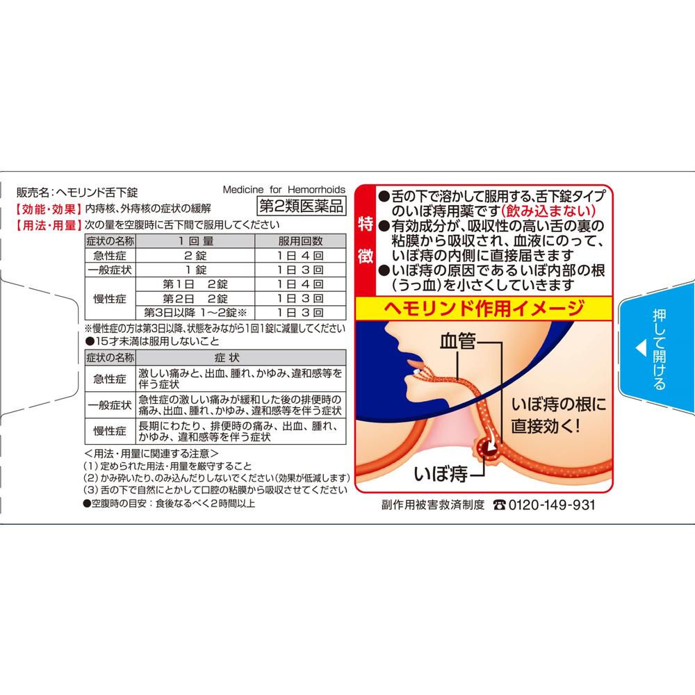 ・用法用量を守ってお使いください。 ・舌下錠ですので、噛み砕いたり飲み込んだりせず、舌の下でゆっくり溶けるのを待ってください。 ・症状が出ている時は特に、お酒、香辛料、タバコを控えましょう。また、入浴・冷えに注意するなど、血行不良に気をつけましょう。 ・お薬を使っても症状を繰り返す場合は、我慢せず、早めに受診しましょう。 ・お使いになって何か気になる症状が出た場合は、使用を中止し、医師・薬剤師・登録販売者にご相談下さい。 ・使用前に、よく添付文書をお読みになってからご使用下さ商品説明●舌の下で溶かして服用する、舌下錠タイプのいぼ痔用薬です(飲み込まない) ●有効成分が、吸収性の高い舌の裏の粘膜から吸収され、血液にのって、いぼ痔の内側に直接届きます ●いぼ痔の原因であるいぼ内部の根(うっ血)を小さくしていきます