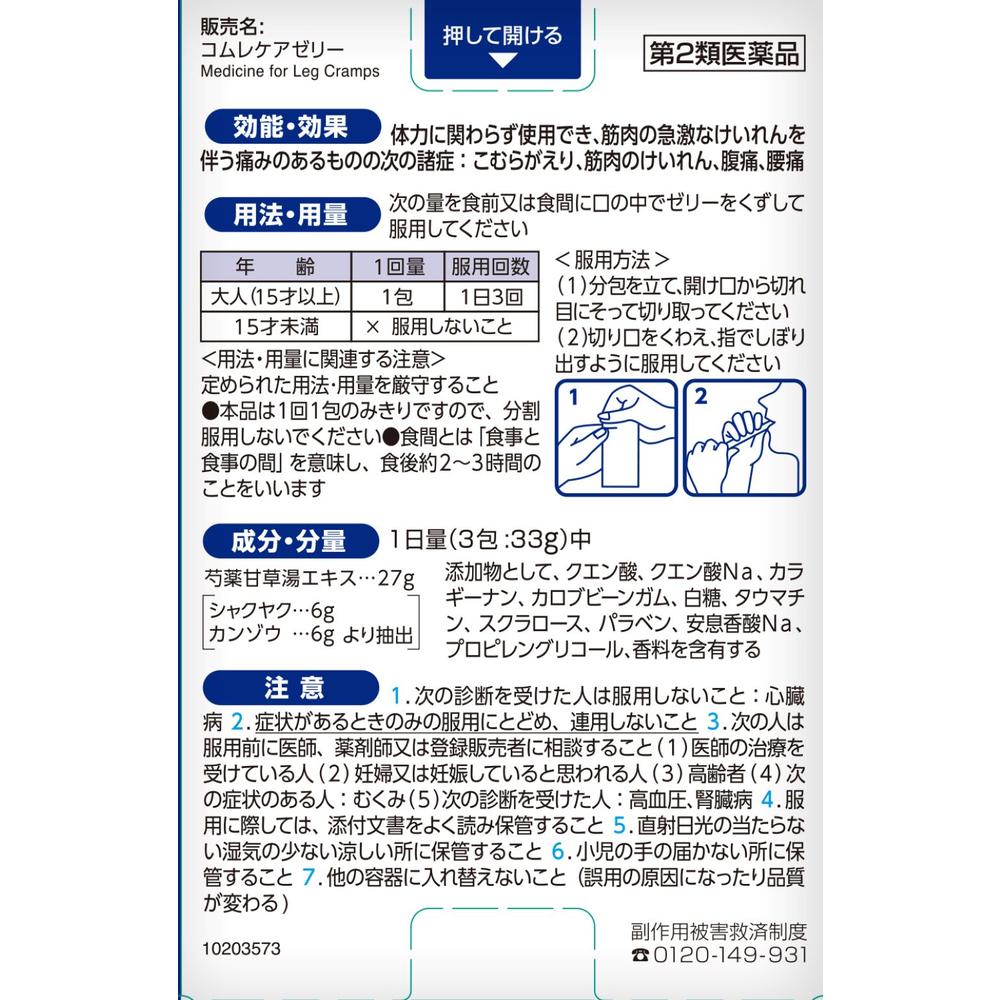 ・服用は症状があるときのみにとどめ、連用しないで下さい。 ・普段からカルシウムなどのミネラルを補給するよう心がけましょう。 ・お使いになって何か気になる症状が出た場合は、使用を中止し、医師・薬剤師・登録販売者にご相談下さい。 ・使用前に、よく添付文書をお読みになってからご使用下さい。その際、ご不明な点がございましたら、薬剤師・登録販売者にご相談下さい。4987072048061商品説明●つらい足のつり(筋肉のけいれん)、こむらがえりを治すお薬です ●漢方処方「芍薬甘草湯」が、筋肉の痛み・こわばりをしっかり静めます ●承認基準内(*)最大量配合の芍薬甘草湯満了処方です(*一般薬製剤承認基準) ●運動時や就寝時など、足がつった時におすすめです ●水なしですぐに服用できるグレープフルーツ風味のゼリー剤です ●ゼリー剤の色・味は天然物(生薬)由来です