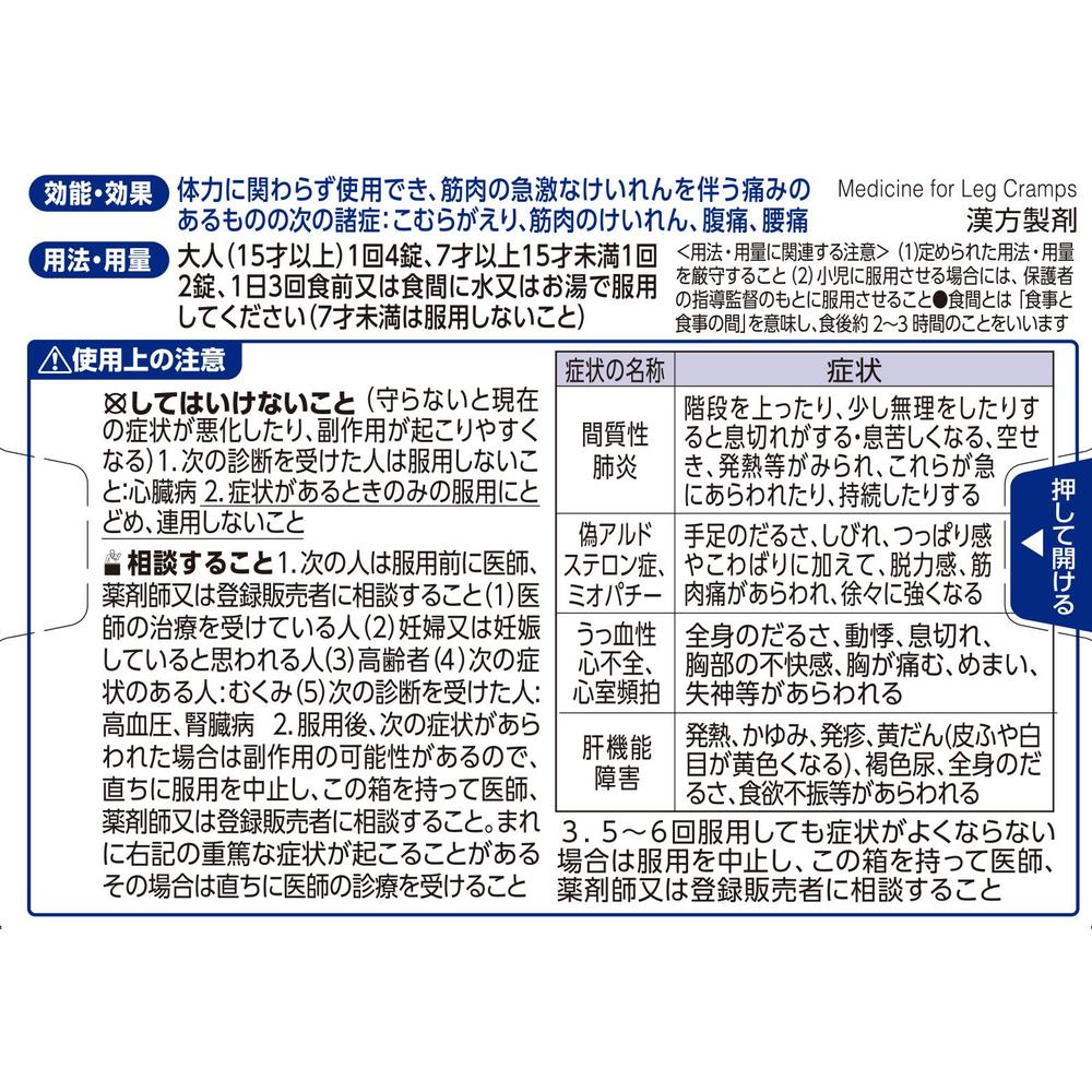 ・服用は症状があるときのみにとどめ、連用しないで下さい。 ・普段からカルシウムなどのミネラルを補給するよう心がけましょう。 ・お使いになって何か気になる症状が出た場合は、使用を中止し、医師・薬剤師・登録販売者にご相談下さい。 ・使用前に、よく添付文書をお読みになってからご使用下さい。 ・その際、ご不明な点がございましたら、薬剤師・登録販売者にご相談下さい。商品説明●つらい足のつり(筋肉けいれん)、こむらがえりを治すお薬です ●漢方処方「芍薬甘草湯」が、筋肉の痛み・こわばりをしっかり鎮めます ●就寝時や外出で歩くときなど、足がつった時におすすめです