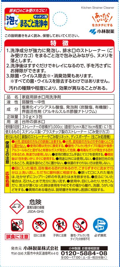 ●排水口のストレーナーに手を汚さずまるごと洗い! ●ヌメリ・ニオイに ●除菌・ウイルス除去 ※すべての菌・ウイルスを除去するわけではありません。 ●週に1度の徹底洗浄 ●洗浄成分が強力に発泡し、排水口のストレーナーをまるごと泡で包み込みながら、ヌメリを落とします ●洗浄後はすすぐだけです。 ※汚れの種類や程度により、効果が異なることがあります。