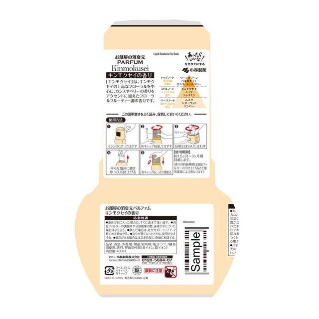●キンモクセイの上品なフローラルを中心に、カシスやベリーの香りをアクセントに加えたフローラルフルーティー調の香りです。 ●ろ紙を引き上げ、好きな強さに香り調節。 ●シャバシャバすれば香り復活。 ●大容量400mLで効果長持ち。 ●再生樹脂を使用したeco容器。