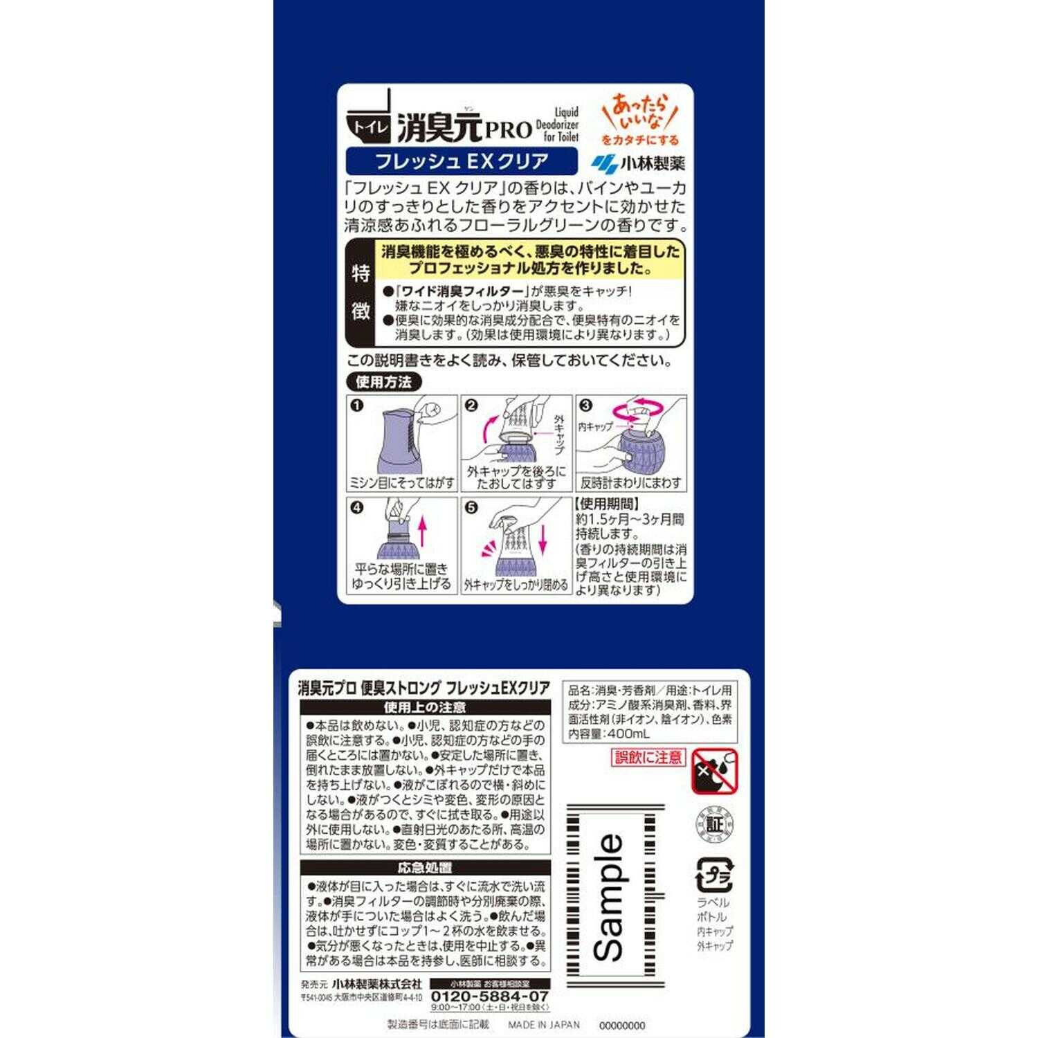 ●消臭機能を極めるべく、悪臭の特性に着目したプロフェッショナル処方。 ●「ワイド消臭フィルター」が悪臭をキャッチ!イヤなニオイをしっかり消臭。 ●便臭に効果的な消臭成分配合で、便臭特有のニオイを消臭します。(効果は使用環境により異なります) ●シャバシャバすれば香り復活。 ●消臭フィルターを引き上げ、好きな強さに香り調節。 ●大容量400mLで効果長持ち。 ●フローラルグリーンの香り