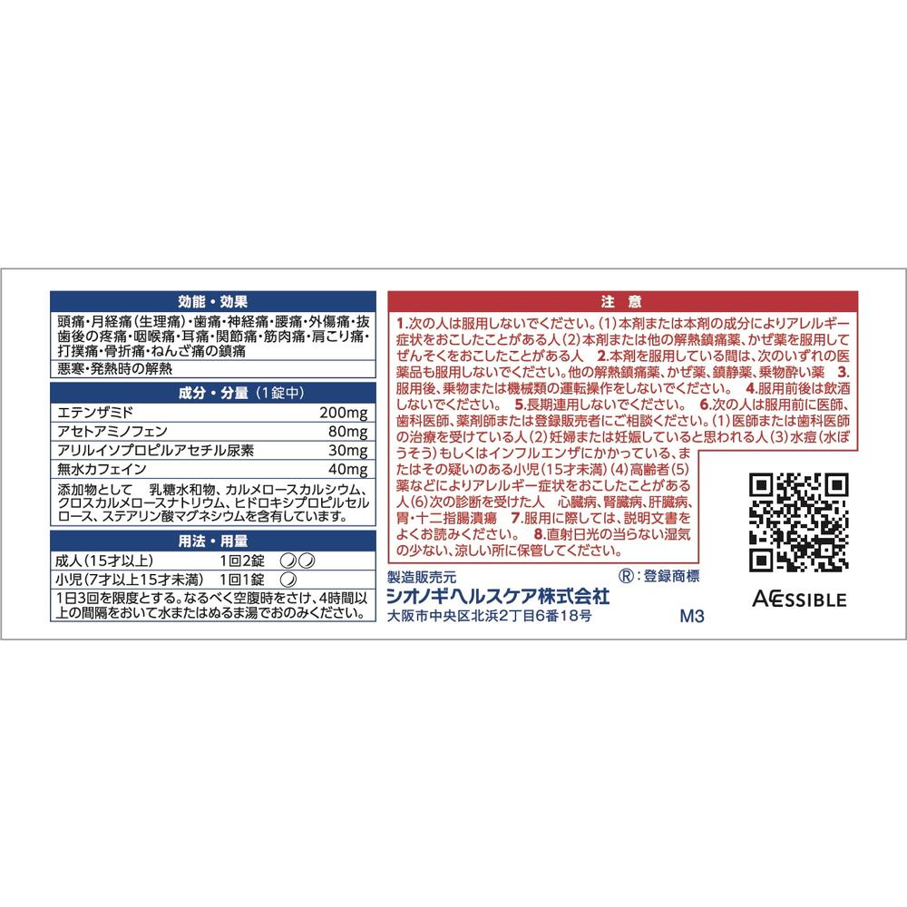 ■してはいけないこと (守らないと現在の症状が悪化したり、副作用・事故がおこりやすくなります) 1.次の人は服用しないでください (1)本剤または本剤の成分によりアレルギー症状をおこしたことがある人 (2)本剤または他の解熱鎮痛薬、かぜ薬を服用してぜんそくをおこしたことがある人 2.本剤を服用している間は、次のいずれの医薬品も服用しないでください 他の解熱鎮痛薬、かぜ薬、鎮静薬、乗物酔い薬 3.服用後、乗物または機械類の運転操作をしないでください(眠気などがあらわれることがあります) 4.服用前後は飲酒しないでください 5.長期連用しないでください ■相談すること 1.次の人は服用前に医師、歯科医師、薬剤師または登録販売者にご相談ください (1)医師または歯科医師の治療を受けている人 (2)妊婦または妊娠していると思われる人 (3)水痘(水ぼうそう)もしくはインフルエンザにかかっている、またはその疑いのある小児(15才未満) (4)高齢者 (5)薬などによりアレルギー症状をおこしたことがある人 (6)次の診断を受けた人 心臓病、腎臓病、肝臓病、胃・十二指腸潰瘍 2.服用後、次の症状があらわれた場合は副作用の可能性があるので、直ちに服用を中止し、この文書を持って医師、薬剤師または登録販売者にご相談ください [関係部位:症状] 皮膚:発疹・発赤、かゆみ 消化器:吐き気・嘔吐、食欲不振 精神神経系:めまい その他:過度の体温低下 まれに次の重篤な症状がおこることがあります。その場合は直ちに医師の診療を受けてください。 [症状の名称:症状] ショック(アナフィラキシー):服用後すぐに、皮膚のかゆみ、じんましん、声のかすれ、くしゃみ、のどのかゆみ、息苦しさ、動悸、意識の混濁などがあらわれる。 皮膚粘膜眼症候群(スティーブンス・ジョンソン症候群)、中毒性表皮壊死融解症、急性汎発性発疹性膿疱症:高熱、目の充血、目やに、唇のただれ、のどの痛み、皮膚の広範囲の発疹・発赤、赤くなった皮膚上に小さなブツブツ(小膿疱)が出る、全身がだるい、食欲がないなどが持続したり、急激に悪化する。 肝機能障害:発熱、かゆみ、発疹、黄疸(皮膚や白目が黄色くなる)、褐色尿、全身のだるさ、食欲不振などがあらわれる。 腎障害:発熱、発疹、尿量の減少、全身のむくみ、全身のだるさ、関節痛(節々が痛む)、下痢などがあらわれる。 間質性肺炎:階段を上ったり、少し無理をしたりすると息切れがする・息苦しくなる、空せき、発熱などがみられ、これらが急にあらわれたり、持続したりする。 ぜんそく:息をするときゼーゼー、ヒューヒューと鳴る、息苦しいなどがあらわれる。 3.服用後、次の症状があらわれることがあるので、このような症状の持続または増強が見られた場合には、服用を中止し、この文書を持って医師、薬剤師または登録販売者にご相談ください 眠気 4.5~6回服用しても症状がよくならない場合は服用を中止し、この文書を持って医師、歯科医師、薬剤師または登録販売者にご相談ください