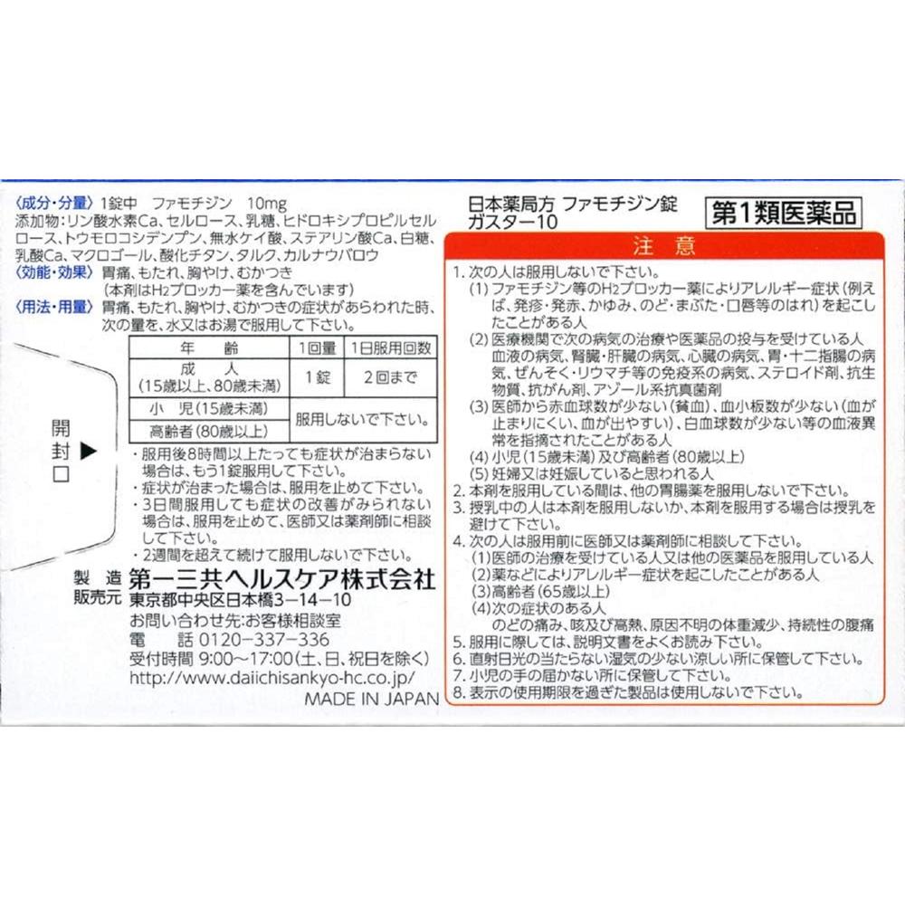 ・3日間服用しても症状の改善が見られない場合は、受診をお勧めします。また、症状の改善が見られても、2週間を超えて服用しないで下さい。 ・症状があるうちは、お酒やコーヒー、香辛料など胃腸を刺激するものは控えましょう。 ・服用しても症状がおさまらない場合や繰り返す場合は、早めに受診しましょう。 ・お使いになって何か気になる症状が出た場合は、使用を中止し、医師・薬剤師にご相談下さい。 ・使用前に、よく添付文書をお読みになってからご使用下さい。その際、ご不明な点がございましたら、薬剤師にご相談下さい。商品説明セルフメディケーション税制対象 ※「ファモチジン製剤(ガスター10シリーズ等)」は、より安全にご使用頂くためご購入個数を制限しております 万が一、購入個数を超えたご注文を発見した場合には、恐れ入りますがキャンセルさせて頂きます。 ●「ガスター10」は、胃の症状の原因となる胃酸の出過ぎをコントロールし、胃粘膜の修復を早める薬で、胃酸中和型の胃腸薬とは異なるタイプの胃腸薬です。