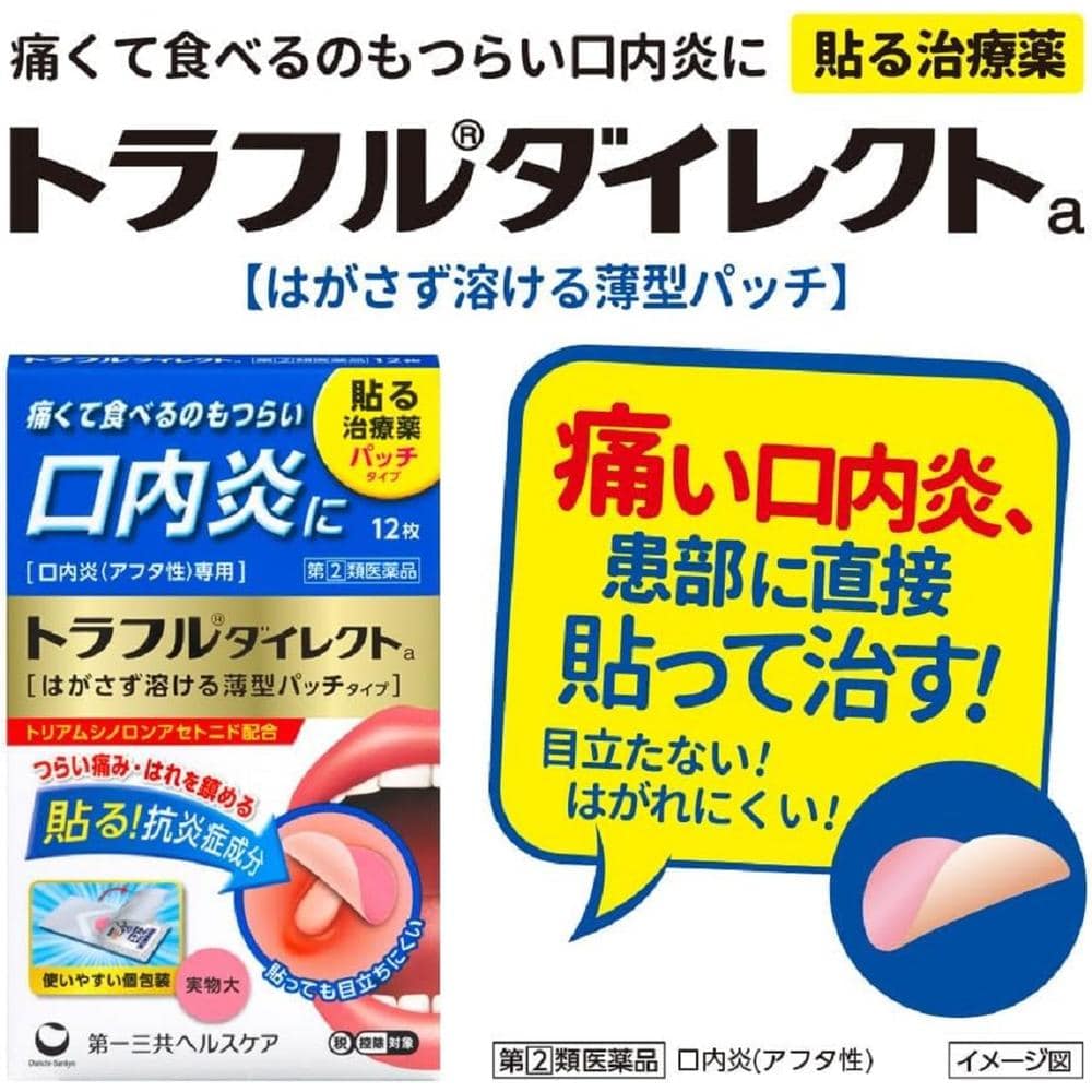 ・使用方法を間違えると付着しないことがあるので、使用前によく使用方法を読んでご使用下さい。 ・口内炎が広範囲に広がったり、数が増えたり、膿みが出たりする場合は感染性の口内炎の疑いがありますので、使用を中止し受診することをお勧めします。 ・よく口内炎ができる方は、日頃から口の中を清潔にし、疲労・睡眠・栄養面にも気をつけると良いでしょう。 ・お使いになって何か気になる症状が出た場合は、使用を中止し、医師・薬剤師・登録販売者にご相談下さい。 ・使用前に、よく添付文書をお読みになってからご商品説明セルフメディケーション税制対象 ●無味・無臭、口内でも目立ちにくいフィルムタイプ。 薄いフィルムから有効成分が溶け出し、口内炎にダイレクトに効く。 ●効き目のすぐれた抗炎症成分「トリアムシノロンアセトニド」を配合。 はれや痛みなどを伴うつらい症状に効果を発揮する。 ●高い貼付力ではがれにくく、口の中で徐々に溶けてなくなるので、はがす必要がない。 ●取り出しやすく、外出時にも便利な1枚づつの個包装。